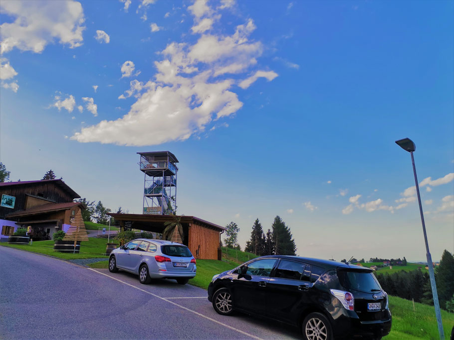 Beim wunderschönen Buschenschank Garber steht der Aussichtsturm (samt Tischen zum Essen), der ich natürlich nicht