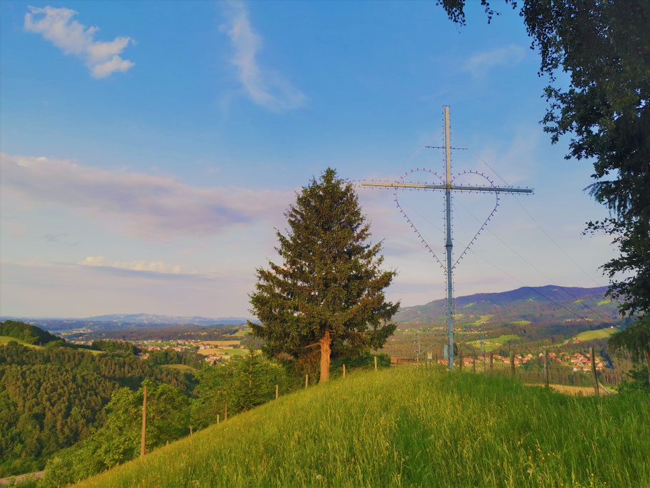 Das Gipfelkreuz am Aibler Kogel (546 m) ist riesig und zugleich eine Hommage an die steirische