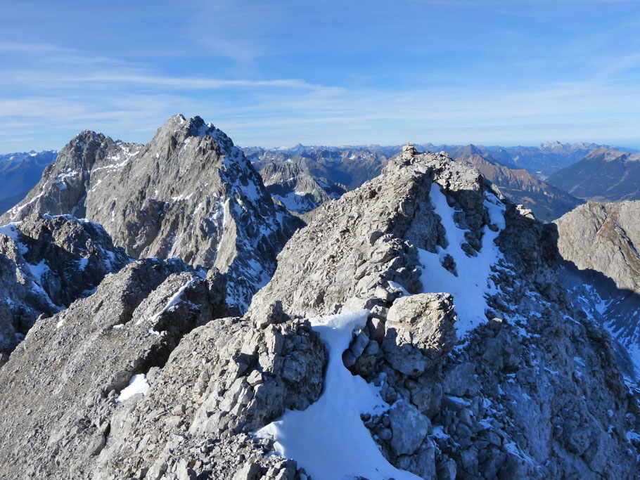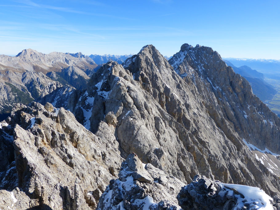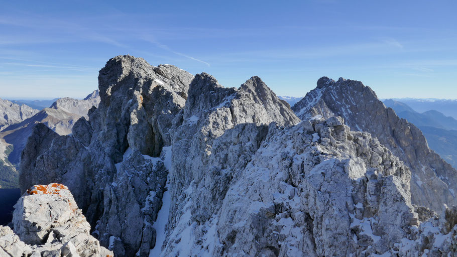 Interessant der weitere Gratverlauf hin zur Mittleren (halblinks) und zur höheren Östlichen Mitterspitze (Mitte), insgesamt als II bewertet, rechts der Hochplattig. Die vermeintliche Schneefreiheit täuscht.