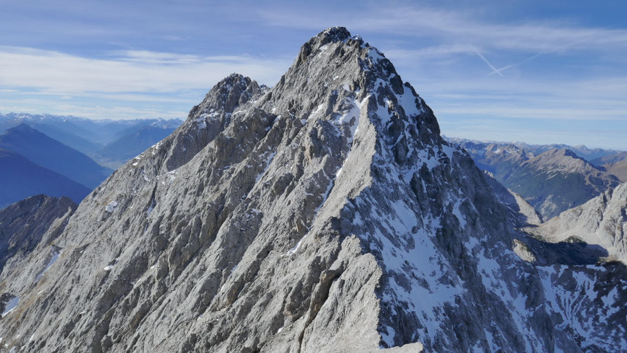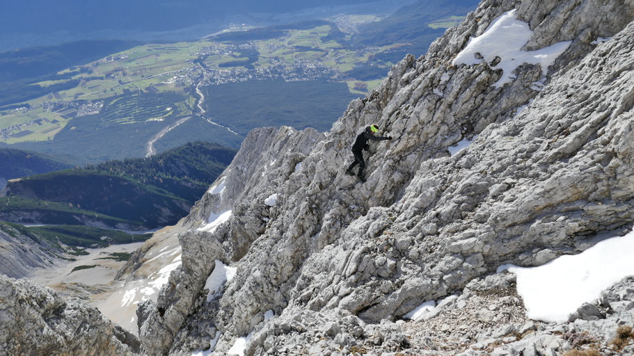 Die Mitterspitzen sind für ihre Brüchigkeit berüchtigt. Aufgrund des starken Windes und den schneegefüllten Passagen am Grat wurde es nichts mit der Überschreitung, daher gaben wir uns mit der Westlichen Mitterspitze (2.688m) sowie dem Hauptgipfel (2.693m) zufrieden. Route: Obermieming (900m) - mit MTB auf den Henneberg (1.360m) - über die Steilschrofen bis unter den Westl. Schoßkopf und Querung zur Gr. Schoß (1.920m) - durch das Kar und linkshaltend kletternd durch den Felsgürtel, weiter im Gehgelände zur Scharte (2.570m) und am Westgrat zum Kreuzgipfel. Kurzer Abstecher zum höchsten Punkt, dann alles auf selbem Weg retour.