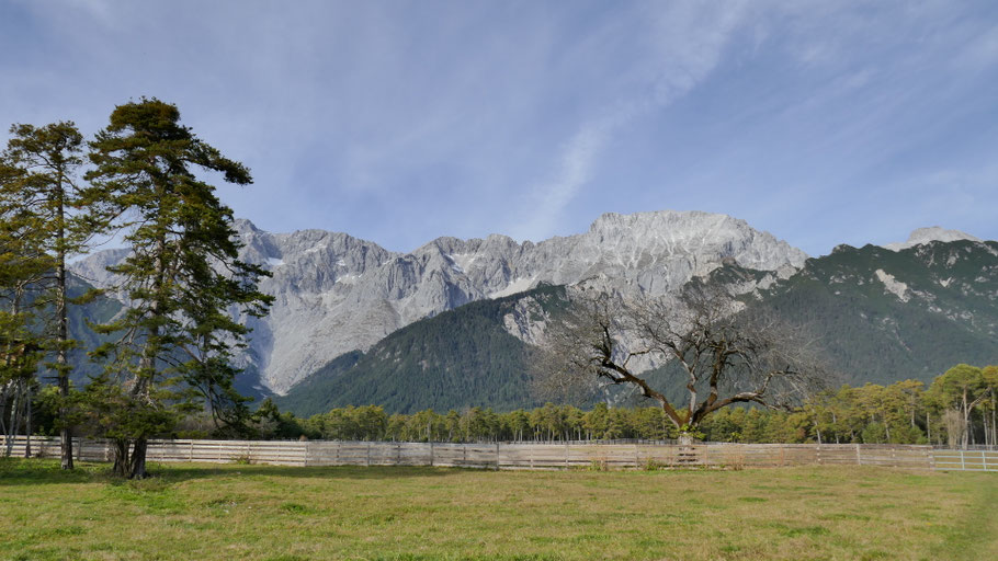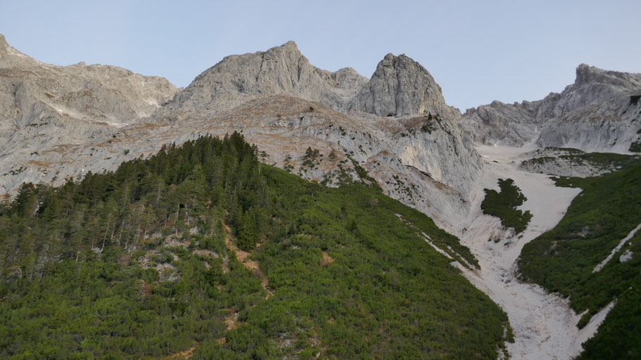 Der Anblick der schroffen Mieminger ringt uns zum wiederholten Mal Respekt ab, das ist auch gut so. Wie bei meiner Solo-Überschreitung der Griesspitzen steigen wir durch das Wäldchen hinauf zu den Steilschrofen und beim Ansatz des Westl. Schoßkopfes links hinaus in die Gr. Schoß. Noch schaut es gut aus: kaum Schnee zu sehen. Runterkommen würden wir durch die verdeckte Kleine Schoß und die Neualblreise rechts. Als dritte Möglichkeit gäbe es den Schoßkopfgrat selbst (III, brüchig), der direkt auf die Westl. Mitterspitze zuläuft.