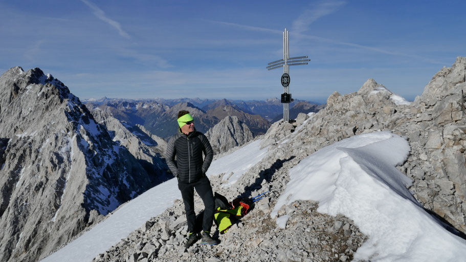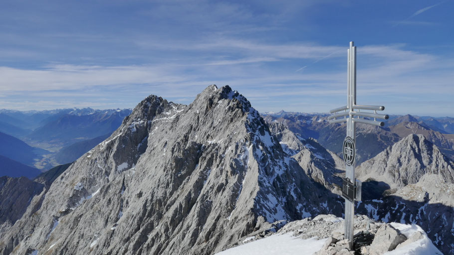 Am Kreuzgipfel der Westl. Mitterspitze (2.693m). Die Mieminger Berge, und insbesondere die Mitterspitzen, sind für ihre Brüchigkeit berüchtigt. Leider hat der eiskalte Wind und der am Grat präsente Altschnee die Überschreitung bis zur Östlichen verhindert.