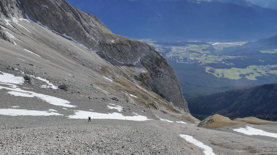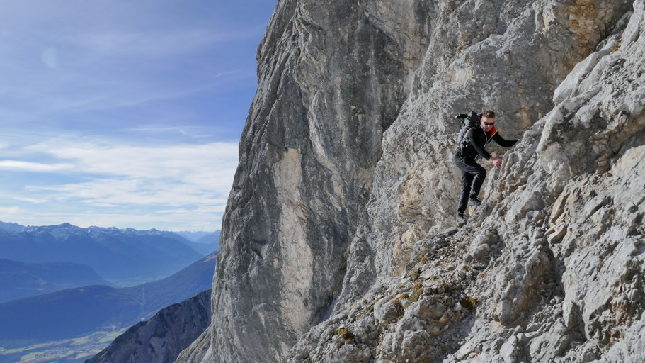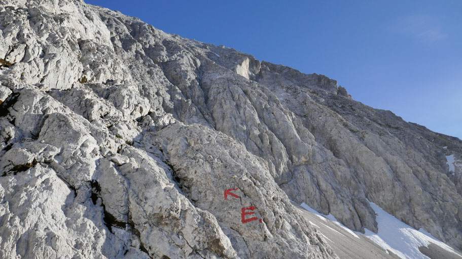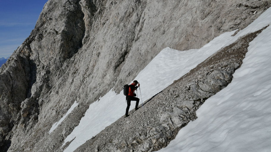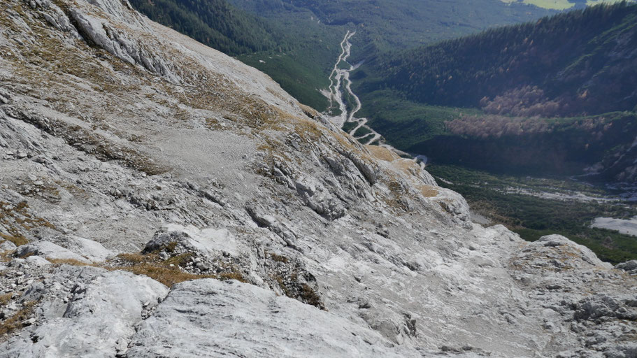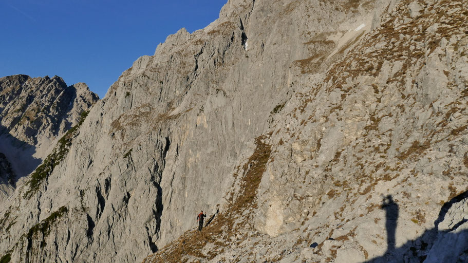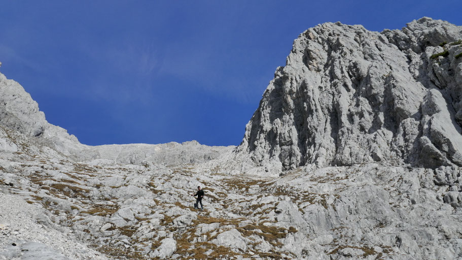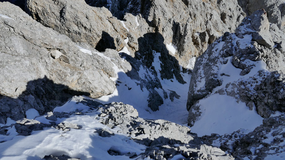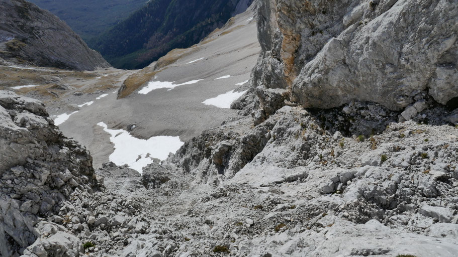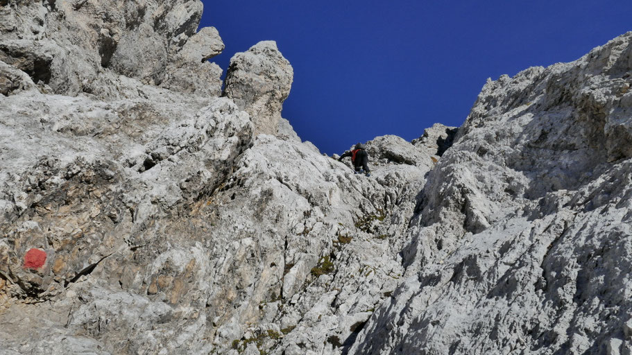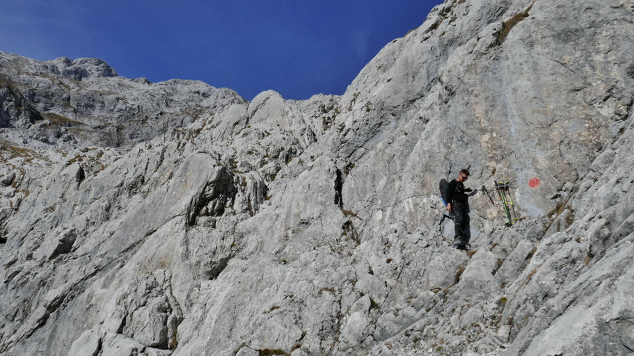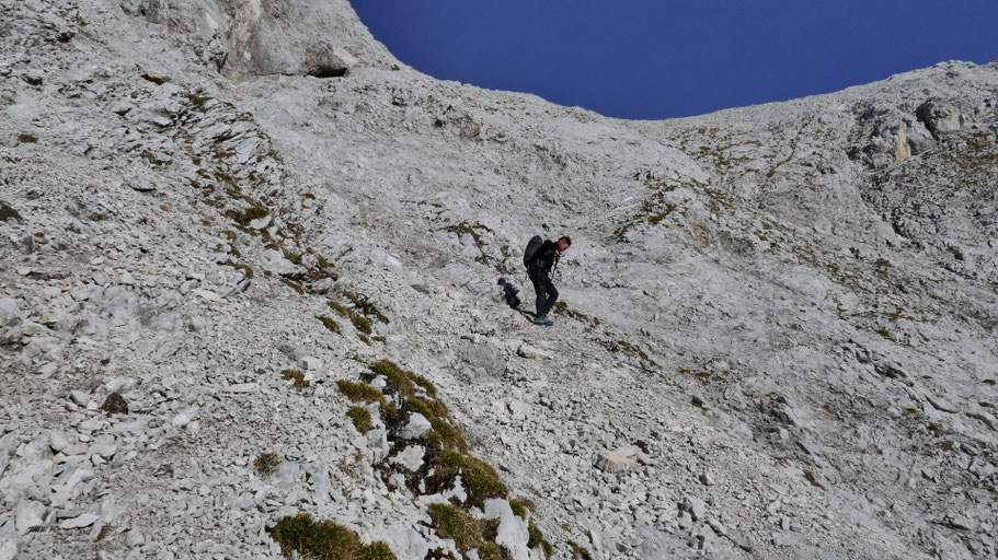 Zuerst steigt man in eine, erraten, brüchige Rinne ab um sich dann gegenüber zum Steinmann zu hanteln. Schnelles Tempo ist hier nicht.