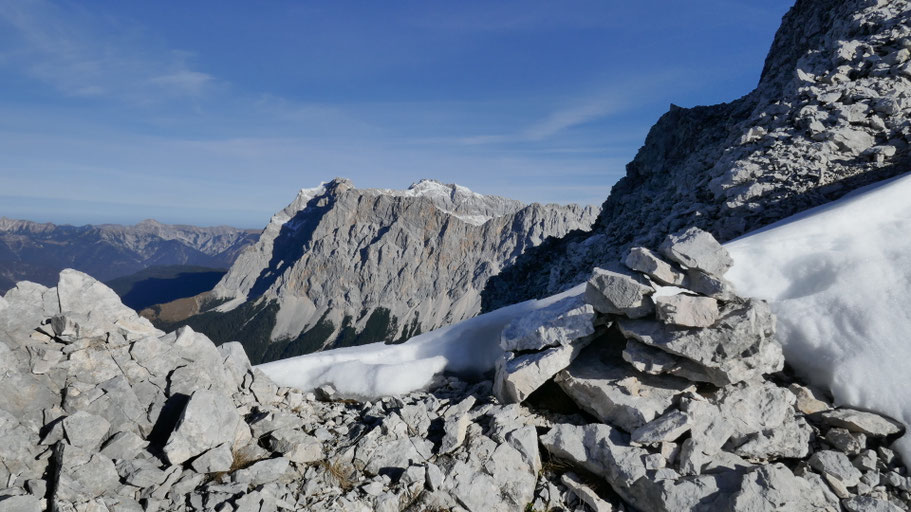 Endlich in der Scharte (2.560m) mit Zugspitzblick. Bis auf die etwas monotone Gr. Schoß hat uns der Anstieg gut gefallen.