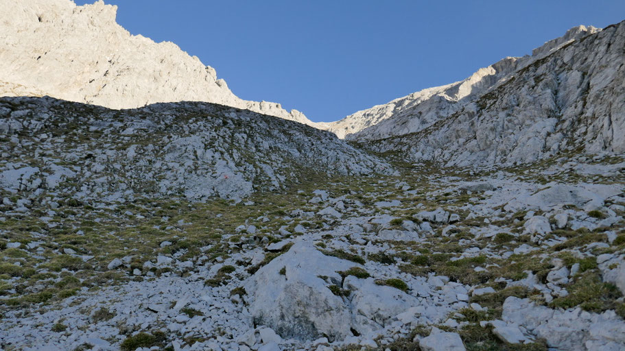 Links zum "Fisch" und weiter zu den Griesspitzen, wir heute geradeaus. Schon früh zeigt sich die Scharte, es sind von hier aber noch 650 Höhenmeter.
