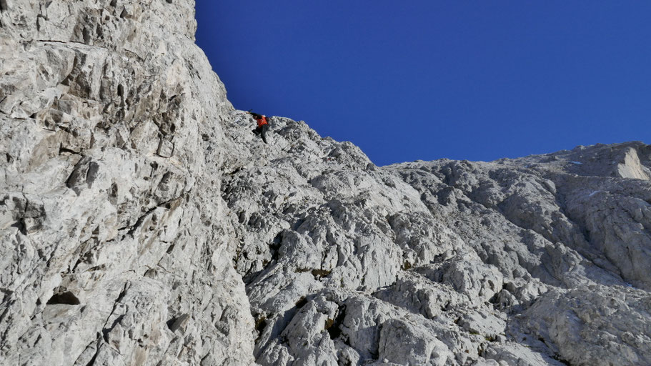 Holger quert schon hinüber Richtung Gr. Schoß. Weiterer Anstieg durch eine versicherte Felsstufe mit zerschlissenem