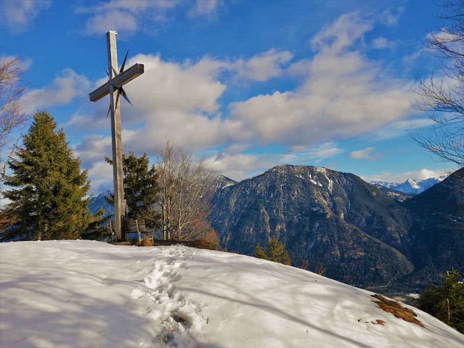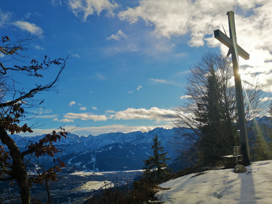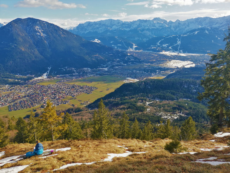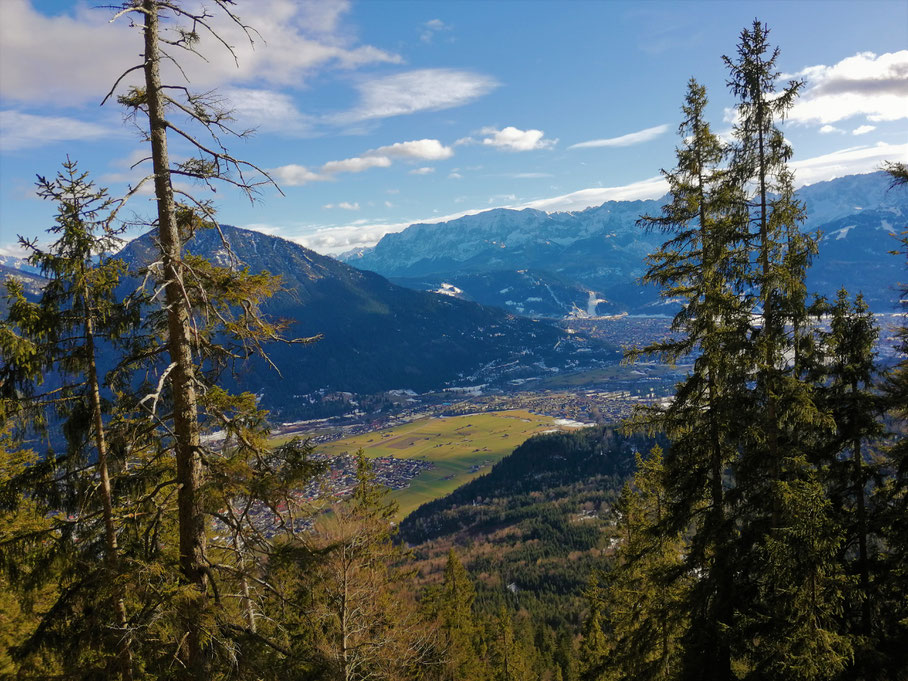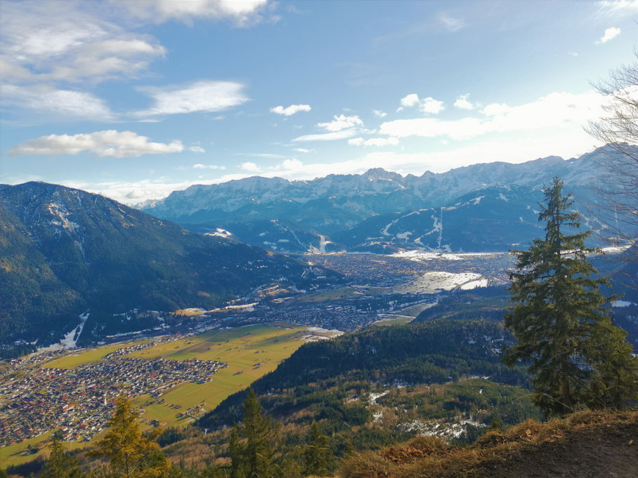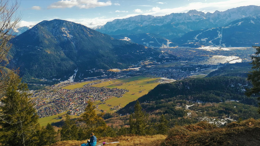 Ein wundervoller Aussichtsgipfel - links unten Farchant, mittig Burgrain und dahinter taucht Garmisch-Partenkirchen mit dem Kreuzeck auf.