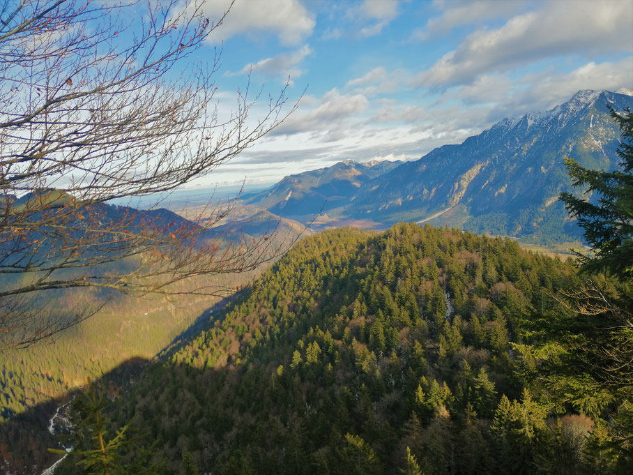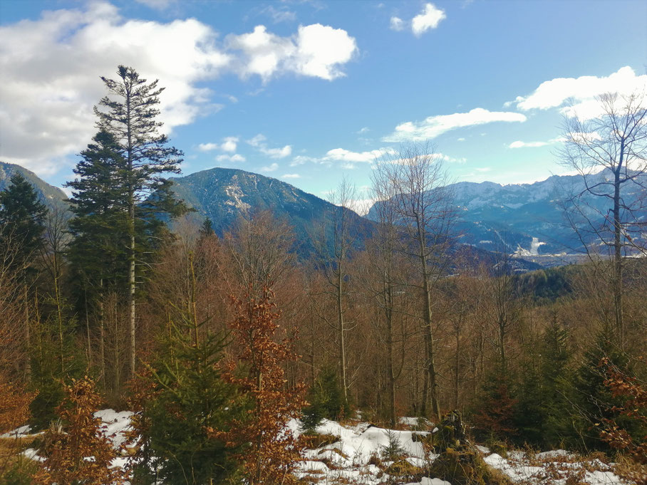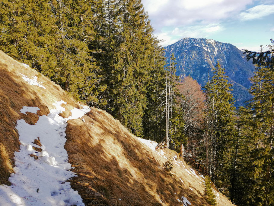 An einer Lichtung lässt sich die schöne Aussicht schon erahnen - dominant auf dieser Tour bleibt der Wank, der Hausberg von Garmisch-Partenkirchen.
