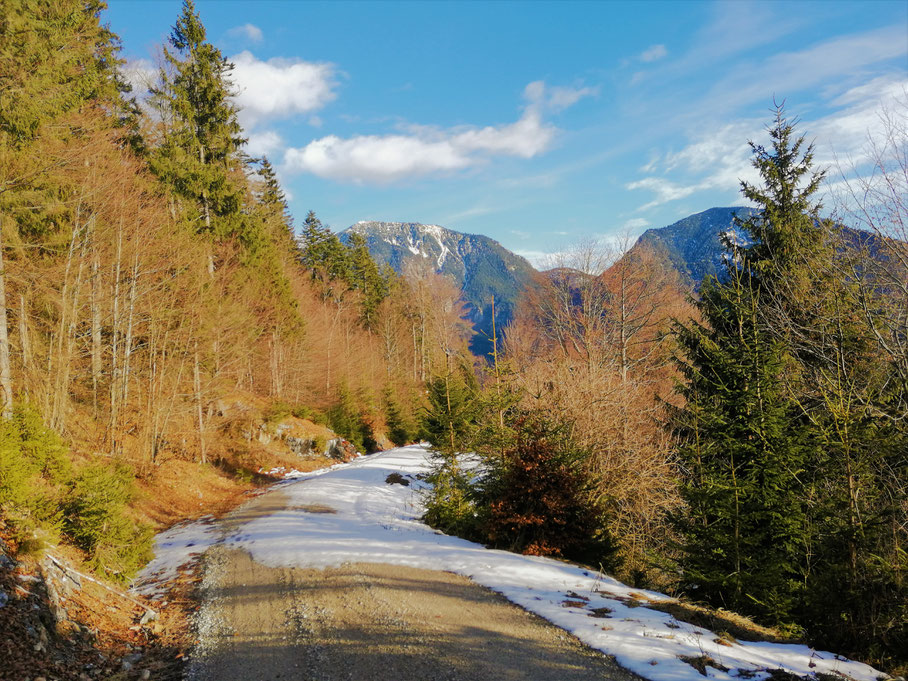 Eine Forststraße führt mich zurück auf meinen Aufstiegsweg - hinten der Brünstelskopf.