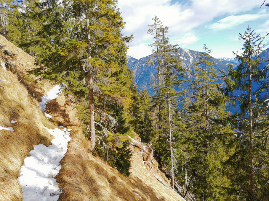Die steilen Wiesen unterhalb des Gipfels werden auf diesem Steig umgangen - und hier ist auch Vorsicht angebracht. Vor allem bei mehr Schnee scheint mir das Ganze hier nicht begehbar zu sein. Zu groß ist die Gefahr von Gleitschnee auf dem schmierigen Untergrund.