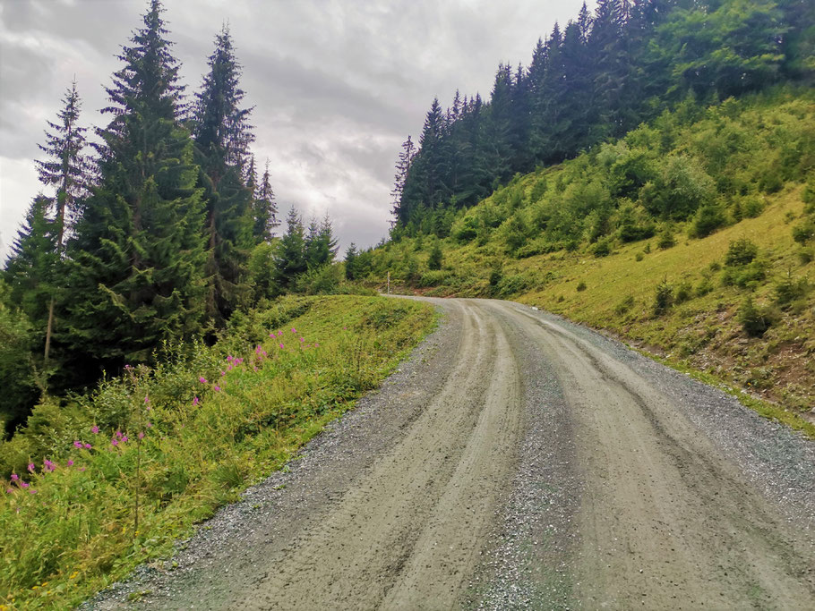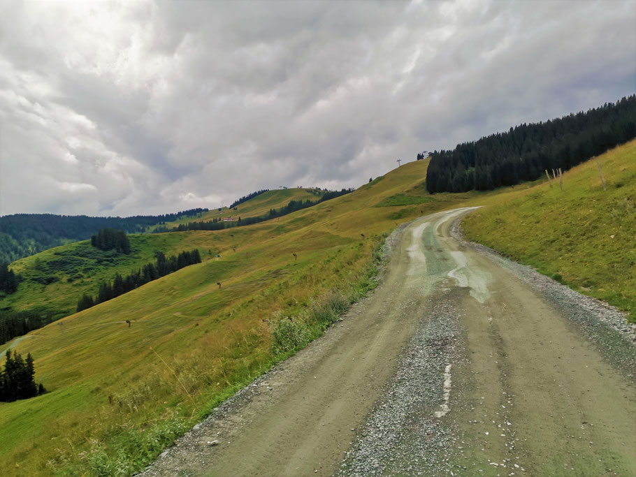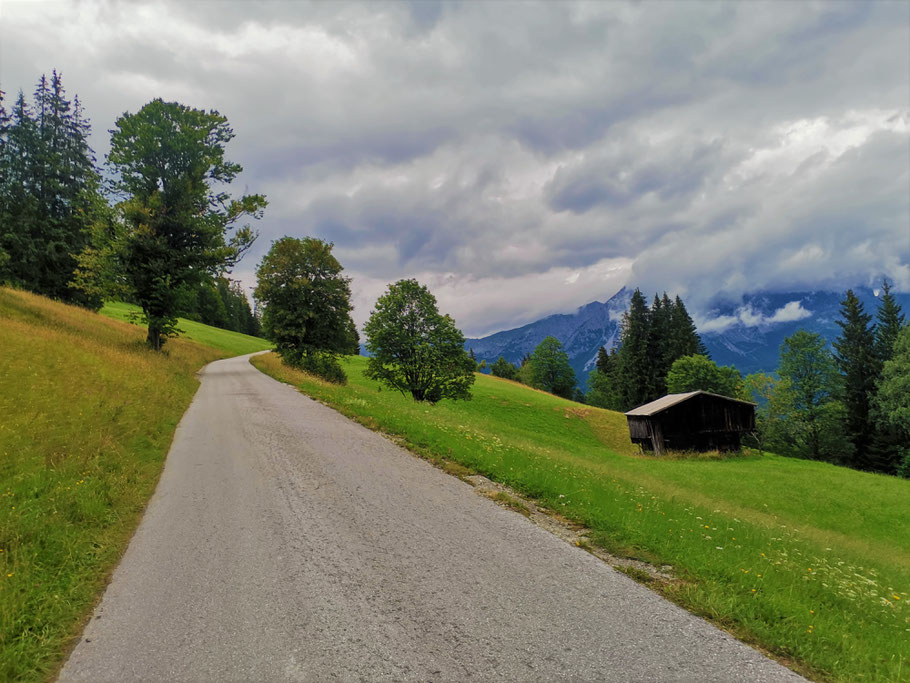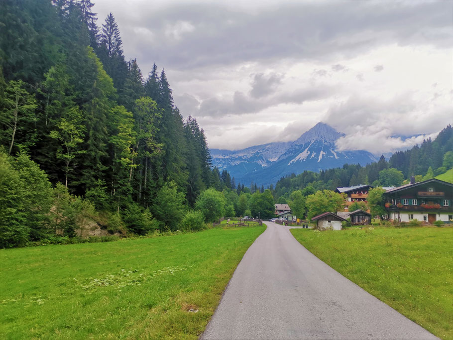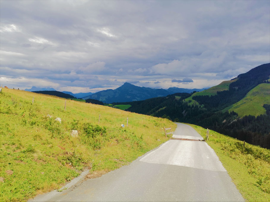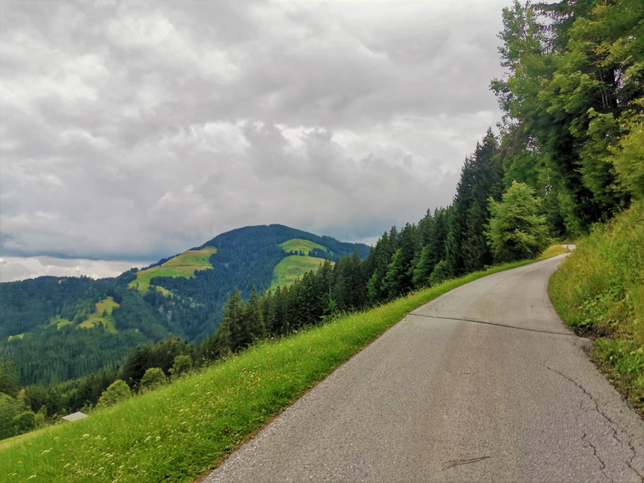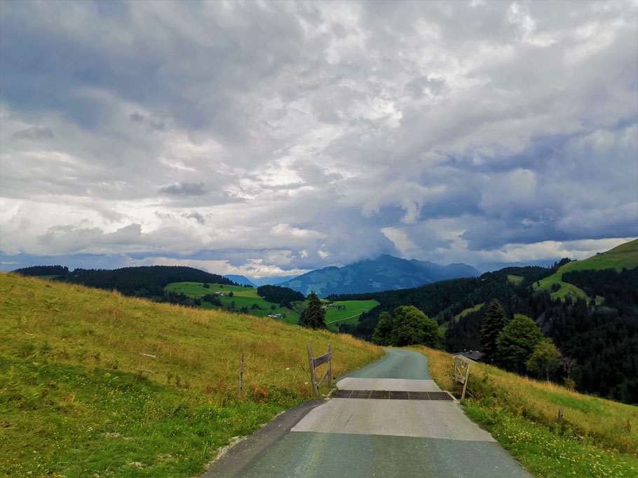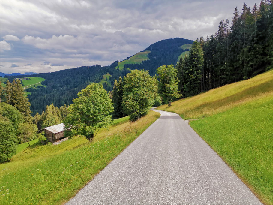 Weißbachgraben trete ich mit dem Wilden Kaiser im Rücken fest in die Pedale. Die angenehme Steigung erleichtert das Aufwärmen, auch wenn das Wetter heute nicht ganz