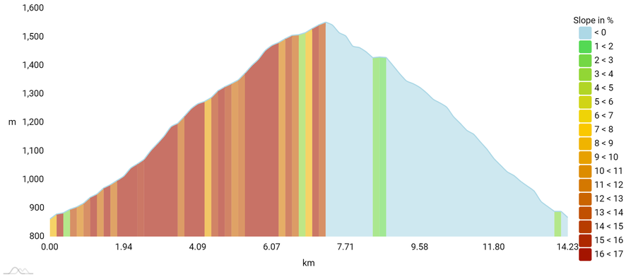 Durch den Weißachgraben auf asphaltierter Straße bis zur Ranhartalm - über wenig steile Forststraßen hinauf bis zum Gipfel - letzte Meter zur Aussichts-Plattform zu Fuß optional - Abfahrt kurz in Richtung Speichersee, dann auf dem Anfahrtsweg.