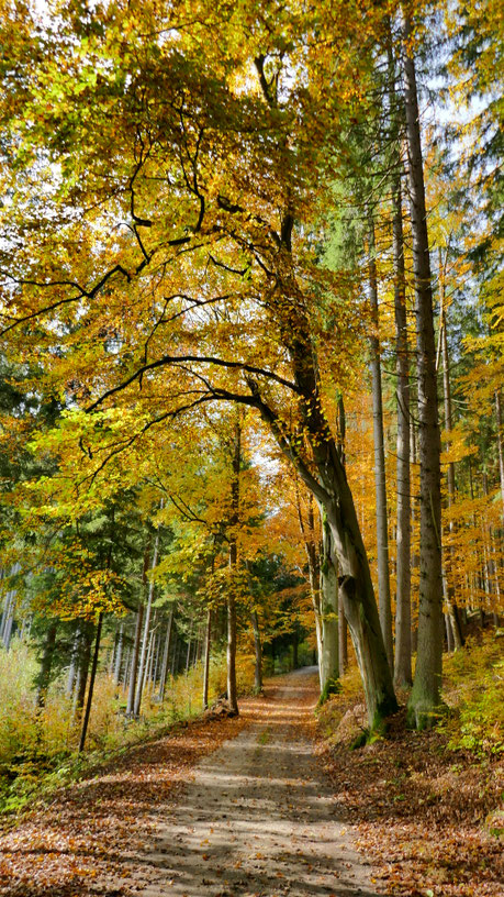 Tagestour im goldenen Herbst mit einer großzügigen Runde vom Wald- ins Mühlviertel und retour: von Zwettl (522m) durch das Zwettltal über Schloß Rosenau (628m) und den Oberrosenauerwald nach Gr. Gerungs (675m). Weiter entlang der Zwettl und über Kleinpertholz (844m) und den Langschlägerwald am Abspannberg (962m) vorbei zur Landesgrenze. Aufwärts nach Liebenau (970m) und zum Brockenberg mit der Warte (1.053m) mit Fernblick auf die nieder- und oberösterreichischen Alpen. Weiter nach Liebenstein zur Jankusmauer (1.017m). Am Rubner Teich vorbei zurück nach NÖ und über Arbesbach (849m), Pretrobruck (775m), die 'Schütt' am Kleinen Kamp und zuletzt das Kamptal nach Zwettl.