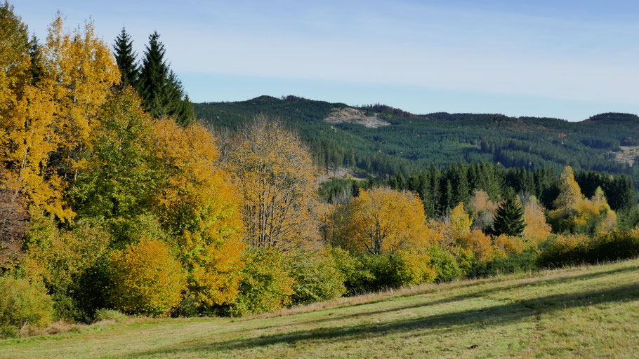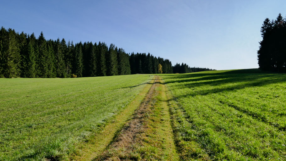 Daddy kennt dieses Gebiet wie seine Westentasche. Geheime Wiesenpfade, schöne Walddurchquerungen. Hinten müsste der Dauerbachberg zu sehen sein.