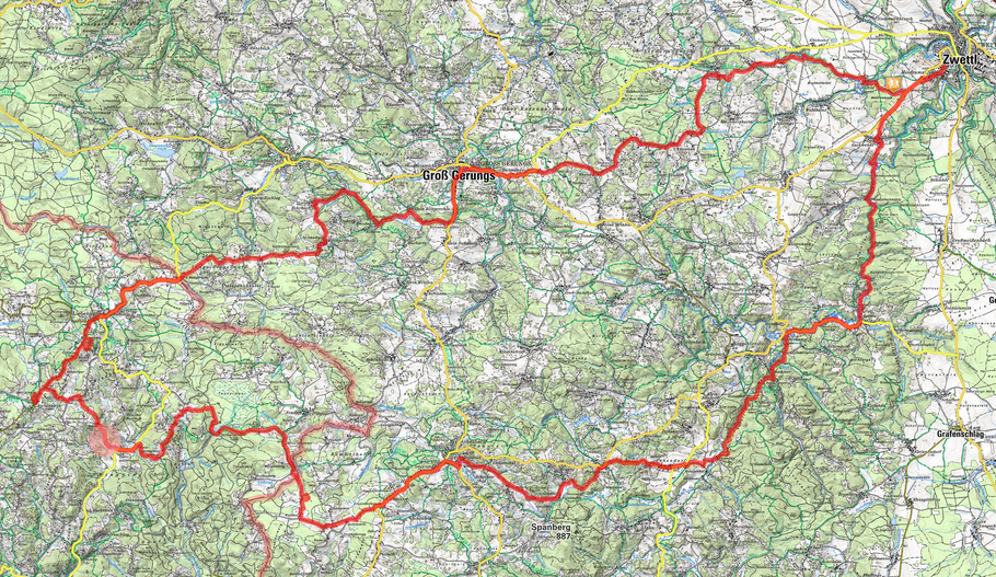 Wo sind wir? Von Zwettl (522m), dem beinahe geografischen Mittelpunkt des Waldviertels im nordwestlichen Niederösterreich führt uns die Route nach Liebenau im oberösterreichischen Mühlviertel zum Brockenberg (1.053m) sowie zur Jankusmauer (1.017m), und über eine großzügige Schleife retour. "Going west" bedeutet hier "going up", von Zwettl steigt es in das Mittelgebirge des Freiwaldes stetig an. Immer ein bisschen, immer mit Gegenanstiegen, wodurch solche Runden am Ende des Tages durchaus fordern.