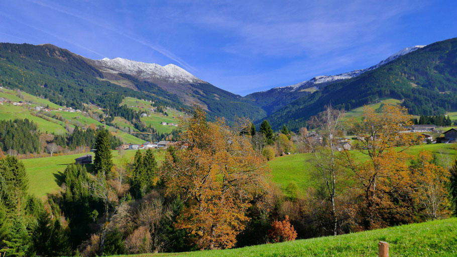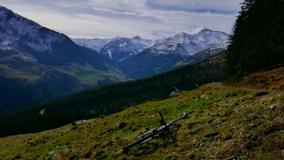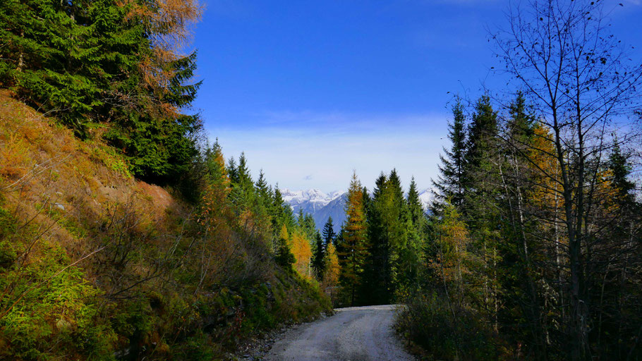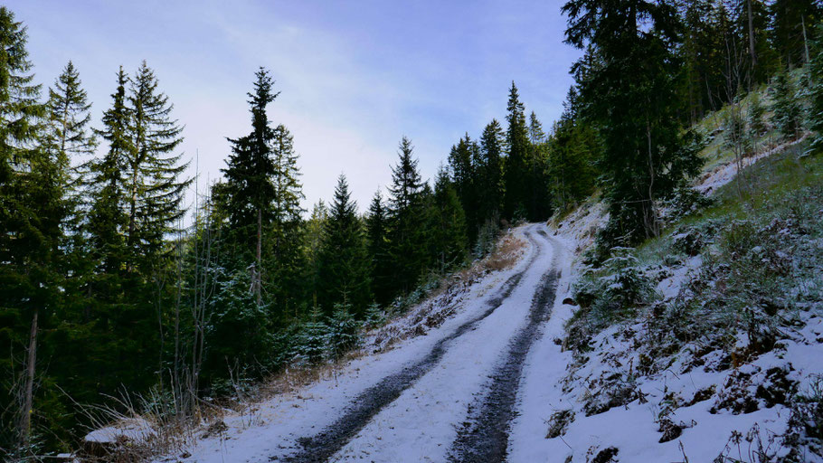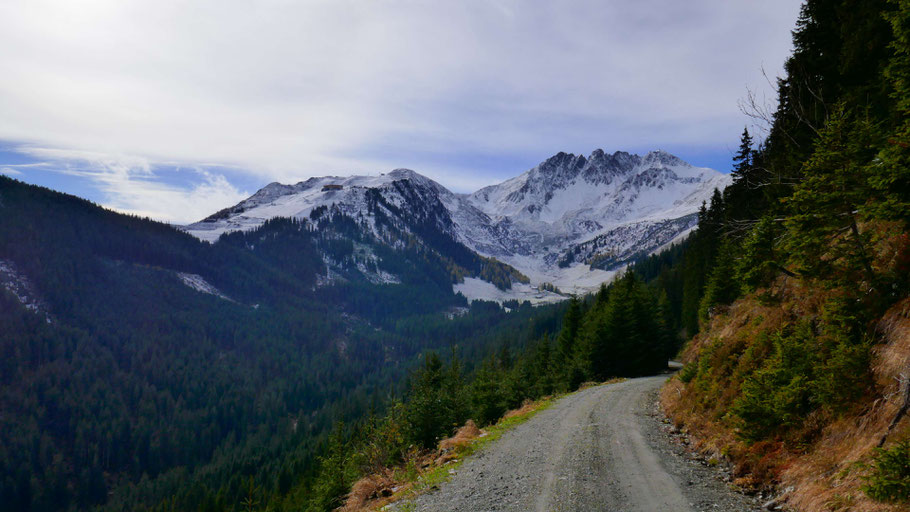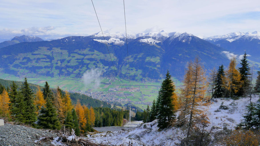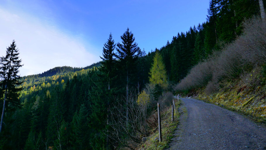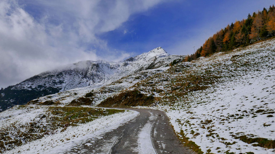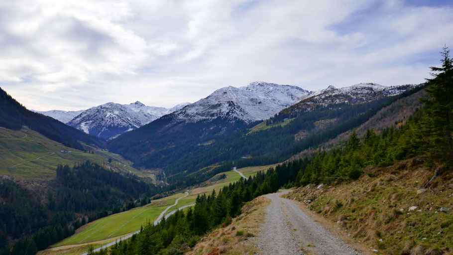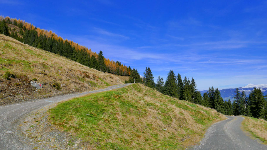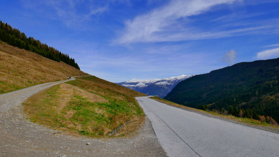 Wunderschöne Abfahrt hinunter. Der Weiterweg wird mich an der Landstraße bis fast nach Hochfügen zu den sichtbaren Pisten führen, dann scharf rechts hinauf zum Loassattel.