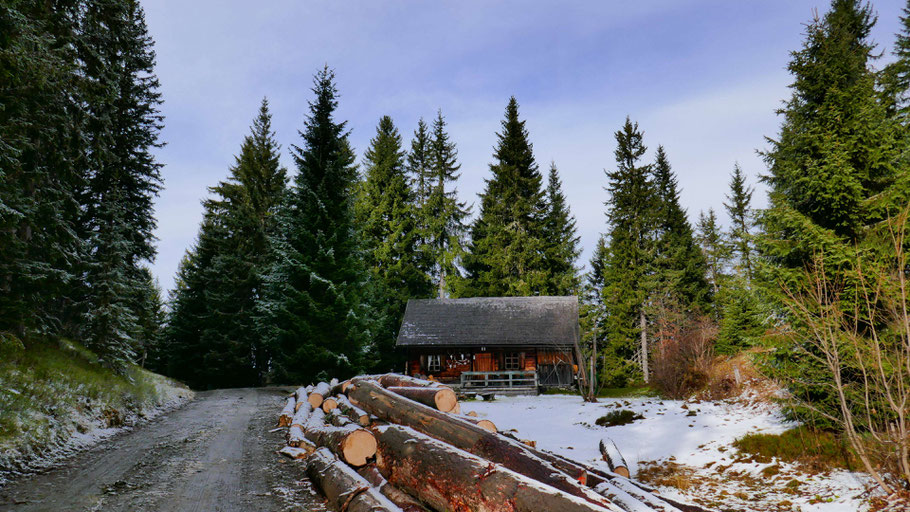 Die Lacken-Jagdhütte auf 1.630m. Erster und längster Anstieg damit geschafft. Kilometer 24 und Fahrzeit 2:30h.