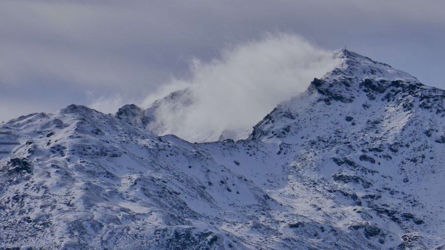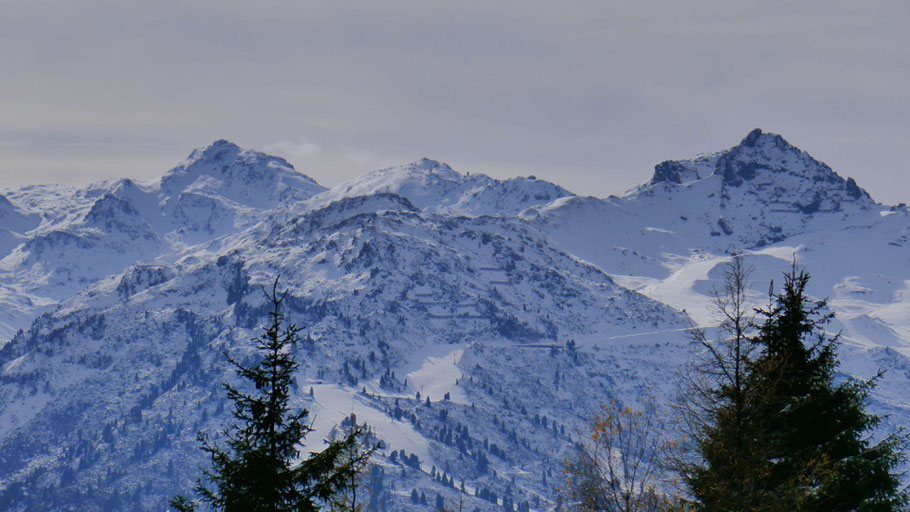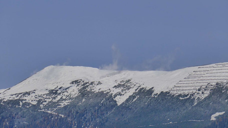 Der verschneite Stanser-Joch-Kamm gegenüber. Meine Tourenwahl sollte sich als richtig erweisen, da ich unterhalb von 1.800m bleibe und auch dem auffrischenden Wind des nahenden Sturms ausweiche.
