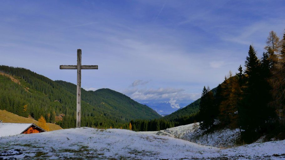 Kreuz an der Kaunzalm (1.525m). Links der vom Gratzenkopf herabziehende Kamm mit Gerstkopf (1.714m) und Durrajoch (1.738m), mittig steht die Lacken-Jagdhütte von vorhin.