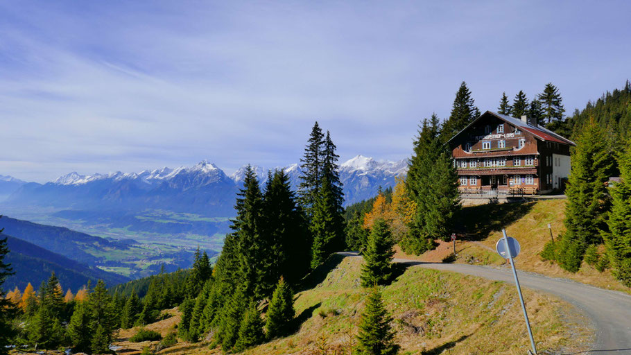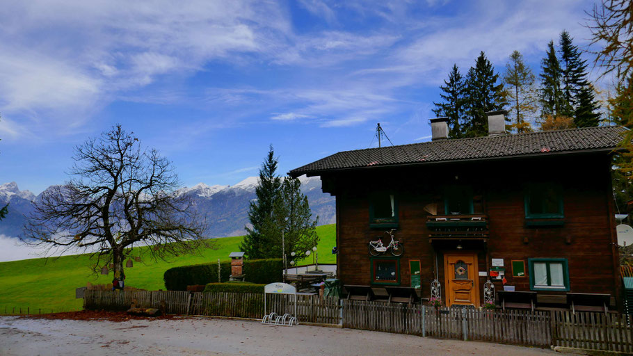 Der schön gelegene Alpengasthof Loas (1.660m) mit weitem Blick Richtung Innsbruck.