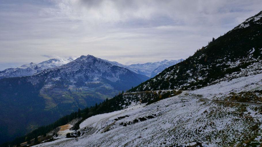 Die Straße zieht steil nach oben. Konnte die Anstrengung gut brauchen, da es empfindlich kalt war.