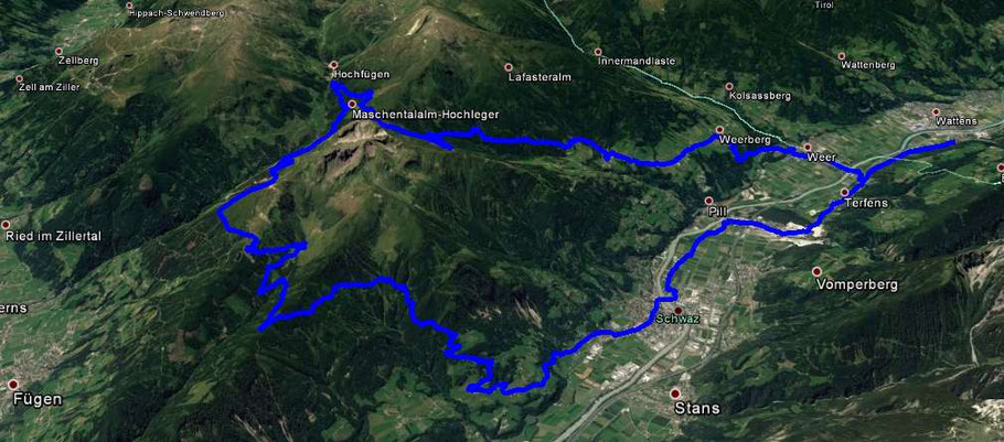 Direkt von Zuhause weg (660m) über Terfens und Vomperbach nach Schwaz (545m). Über Gallzein nach Koglmoos (1.117m) und durch den Wald zur Lackenhütte (1.630m) - bei der Auffahrt schöne Ausblicke in Rofan und östliches Karwendel. In das Öxltal hinunter (1.405m), vor dem Panorama des Kellerjochs zur schönen Kaunzalm (1.525m) und auf steilem Karrenweg hinauf in das Skigebiet Fügen-Spieljoch (1.750m). Im Uhrzeigersinn weiter zur Geolsalm (1.733m) und abwärts zum Niederleger der Gartalm (1.572m). Oberhalb vom Schellenberg (1.320m) zur Straße nach Hochfügen (1.460m) und letzter Anstieg hinauf zum Loassattel (1.680m). Weite Abfahrt durch den Tramwald auf den Weerberg (880m) und über Weer und Terfens retour.