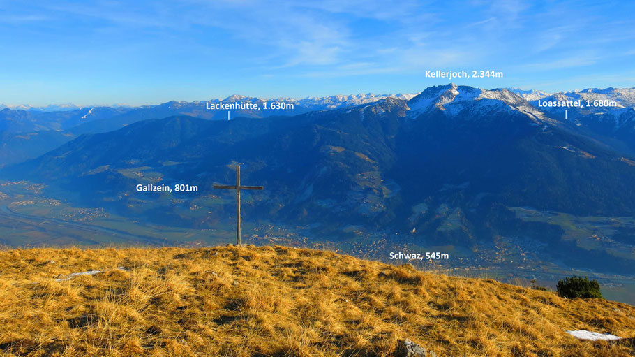 Das Kellerjoch ist der nordöstliche Vorposten der Tuxer Alpen. Die Perspektive vom Hirschkopf (am Anstieg zur Fiechter Spitze, Aufnahme vom Dez. 2016) gibt die Dimension des Massivs gut wieder. Es geht von Schwaz über Gallzein zur Lackenhütte, an der Südseite über diverse Almen hinunter nach Hochfügen, rauf zum Loassattel und zurück.
