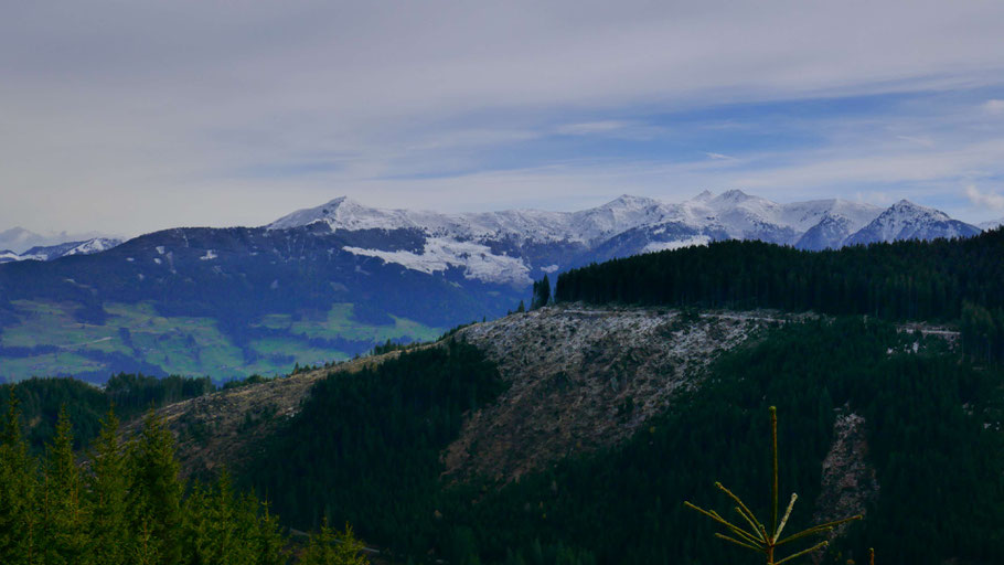 Richtung Osten das (hier nicht sichtbare) Zillertal mit dem Kamm zwischen Wiedersberger Horn und weiter südwärts Standkopf und Hamberg.