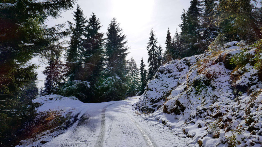Wenige Minuten später fahre ich wieder in schöner Natur. Trotz Schneeauflage alles gut fahrbar.