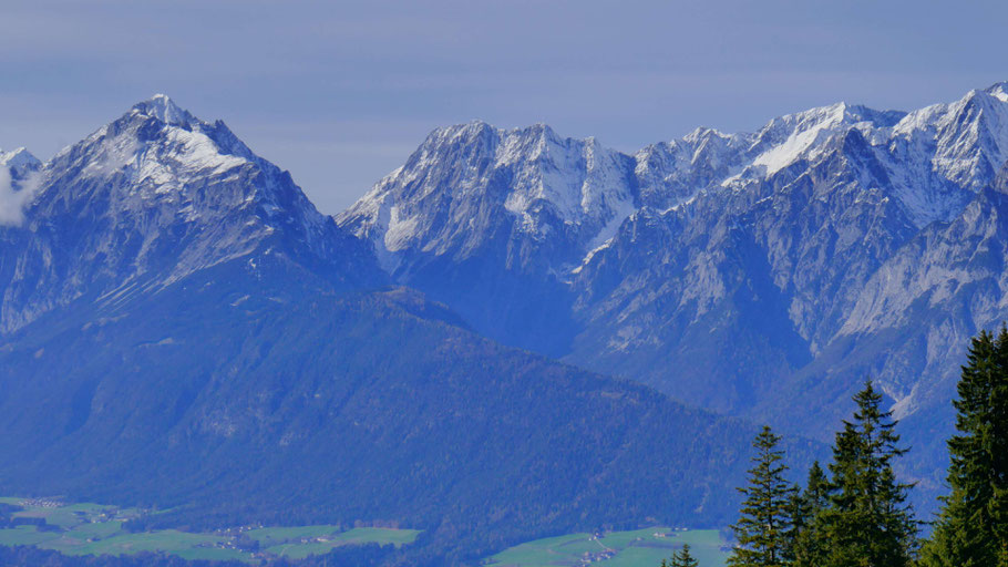 Im Zoom das bewaldete Walderjoch, links der lange Kamm vom Hundskopf zur Hohen Fürleg, dahinter die markante Hochkanzel und rechts die einsamen Gipfel oberhalb des Vomperlochs.