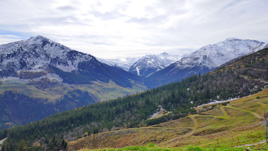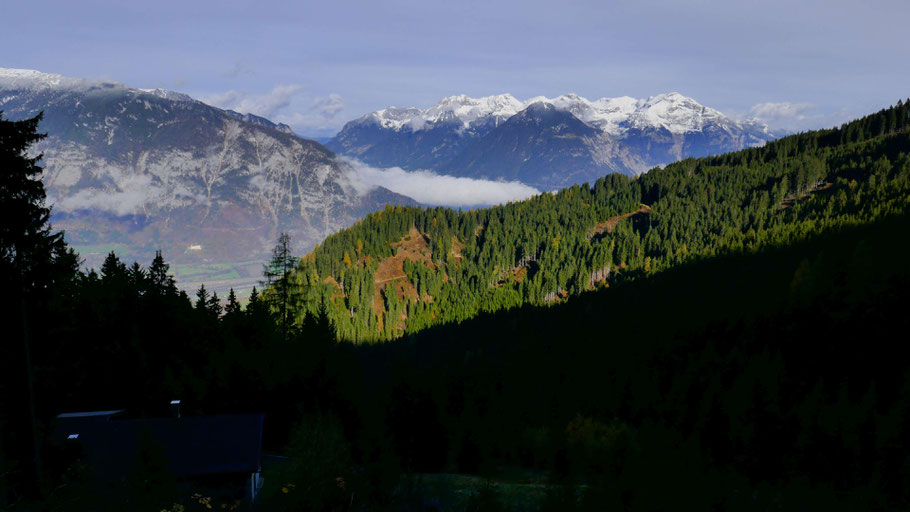 Ich nehme die Variante über den Tramwald. Auf der anderen Talseite Pillberg und im Hintergrund die Rappenspitze mit dem markanten Gipfelzacken.