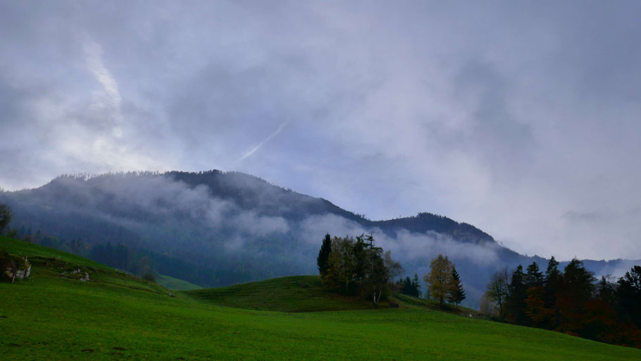 Die Hochnebel lichten sich langsam. Unterhalb des Mehrerkopfs (1.666m) halte ich mich bergauf und weiter ostwärts.