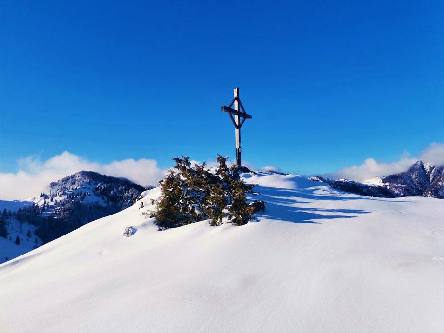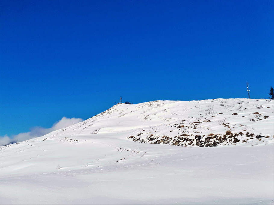 Schnee ist in diesem Jänner ja ein rares Gut, also lasse ich Tourenski und Schneeschuhe beiseite und nehme (ohne Spikes) den Gipfel in Angriff.