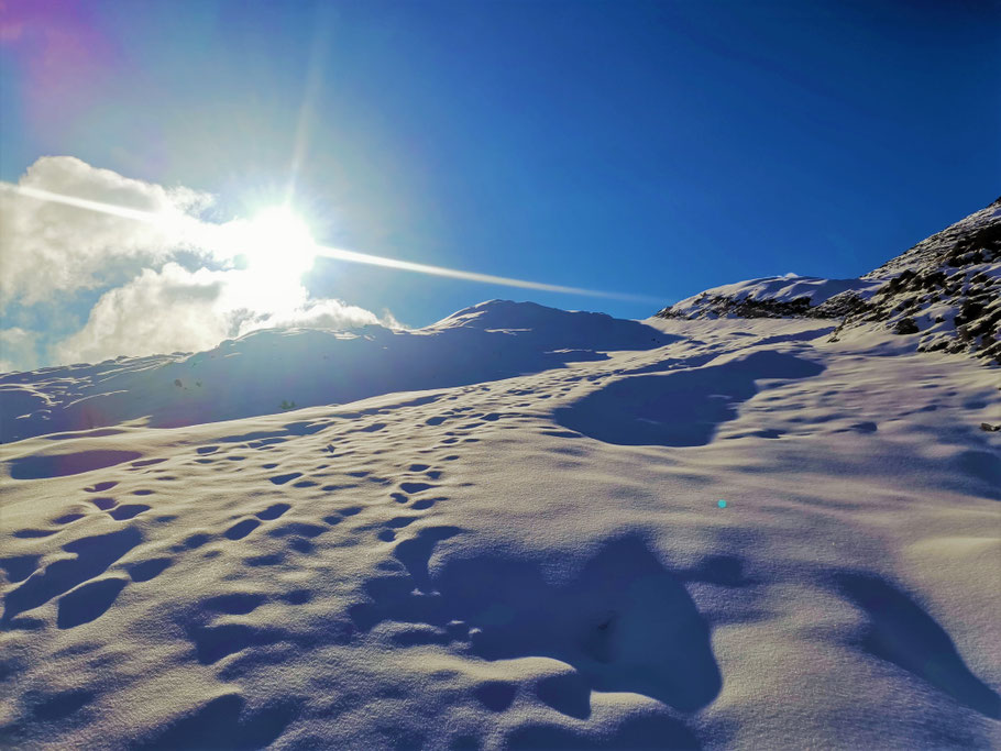 Neuschnee Hänge unter dem Prostkogel, unter denen der Weg verläuft, unter Umständen heikel. Abstieg etwa wie Aufstieg.