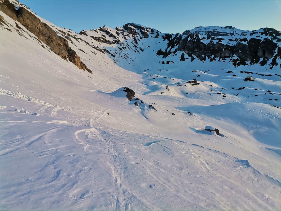 Die Abfahrt ist nie wirklich steil und auch bei hartem Schnee wie hier gut zu fahren - besser wäre es auf Firn zu warten. Aber das spielt sich nicht.