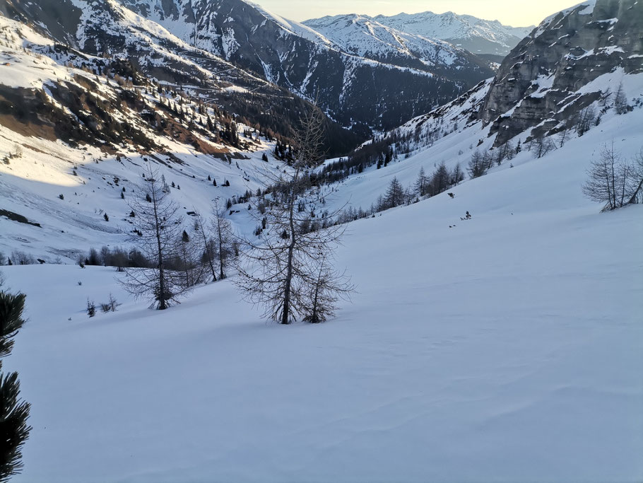 Am Weg oder querfeldein rausche ich bergab - hier zeigt sich eine massive Lawine der letzten Tage aus dem Loosloch. Dieser steile Hang ist auch im Aufstieg zu beachten, wenn man auf der Forststraße bleibt.