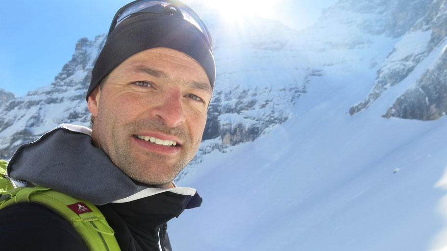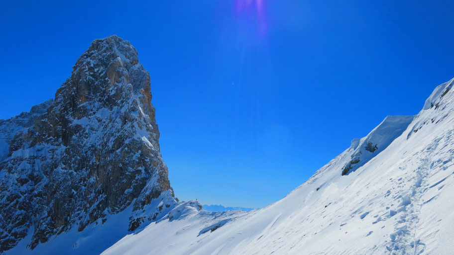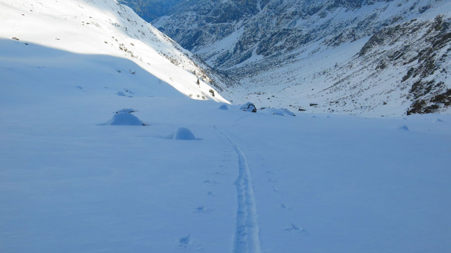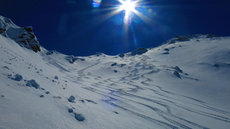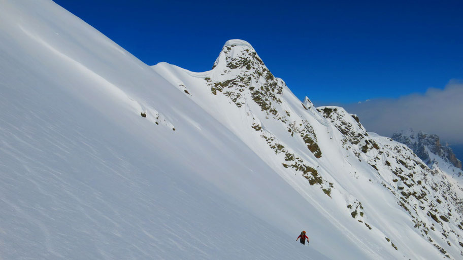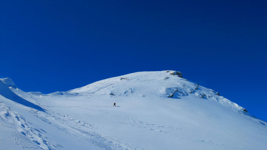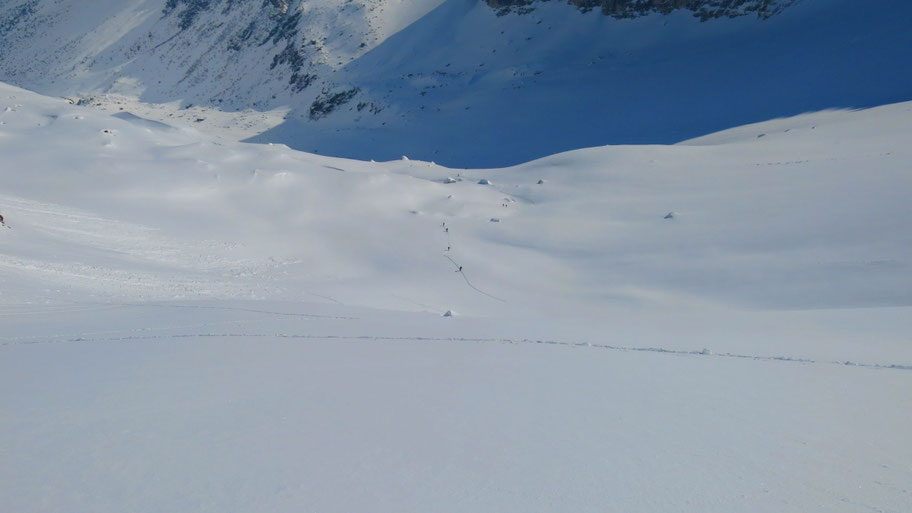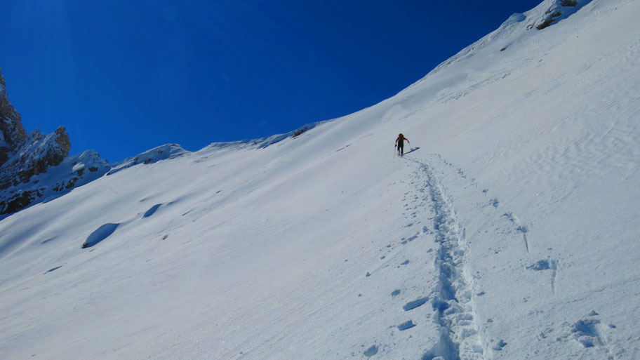 Im oberen steileren Teil des Hanges, bin nach über 1.000hm Spuren froh über die baldige Ablöse.