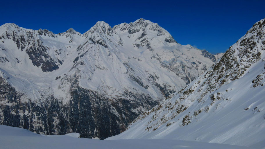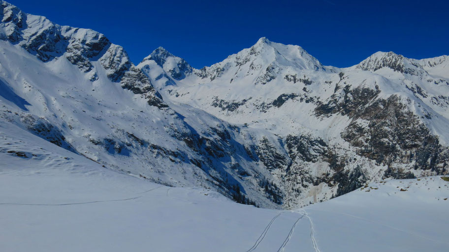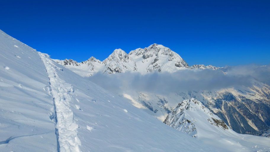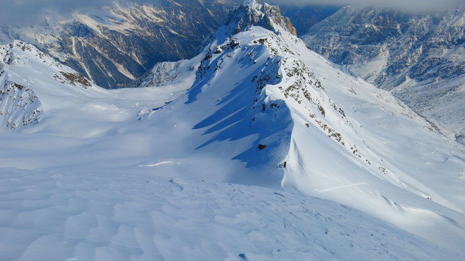 ... und gelangen so ziemlich direkt auf den Nordostrücken vom Pinggl. Im Hintergrund der Grat hinüber zur Gargglerin (2.470m). Rechterhand die das Sandestal bedrohenden steilen Osthänge, zwei Wochen nach meiner Tour gab es einen Lawinenunfall mit einem Todesopfer und einem weiteren Verschütteten, der nach 10 Stunden lebend (!) geborgen wurde.