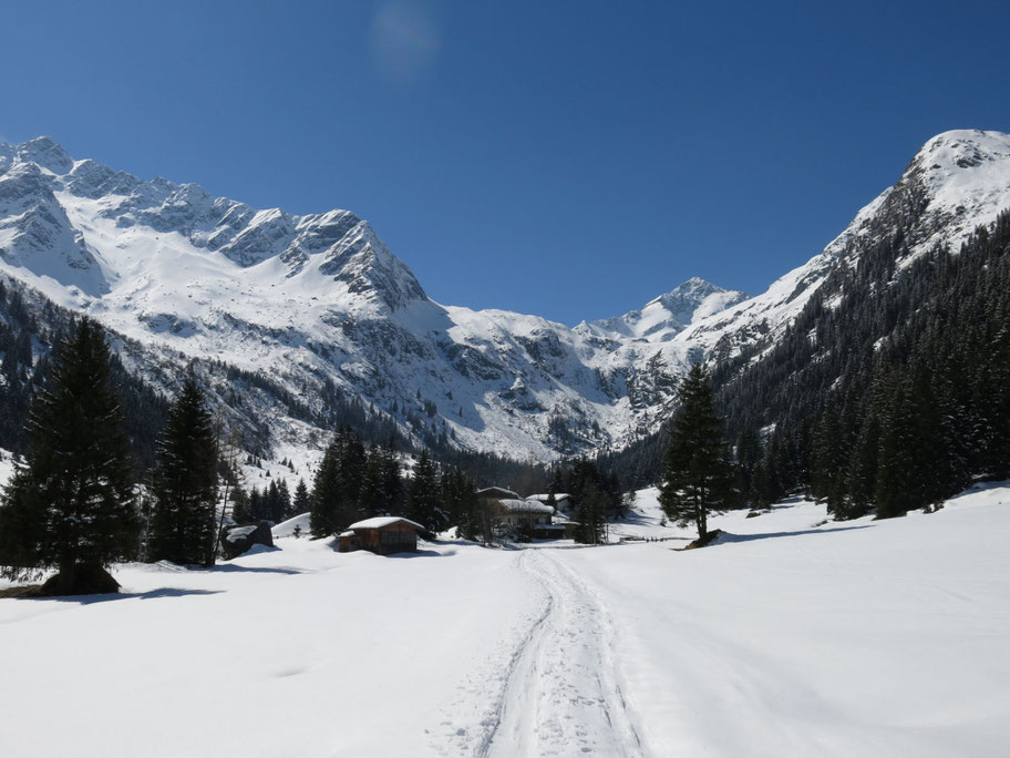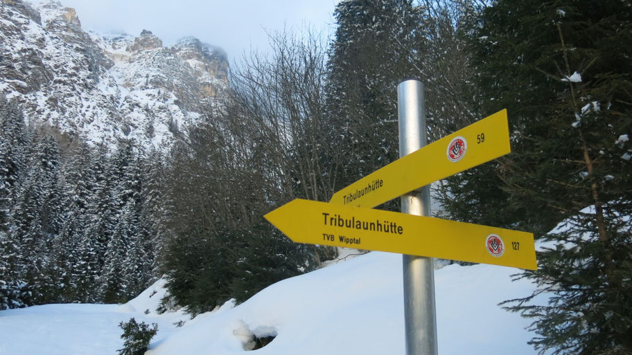 Nach üppigem Neuschnee starte ich beim Ghf. Feuerstein im hinteren Gschnitztal (1.281m) und halte mich am Forstweg aufwärts zur österr. Tribulaunhütte.