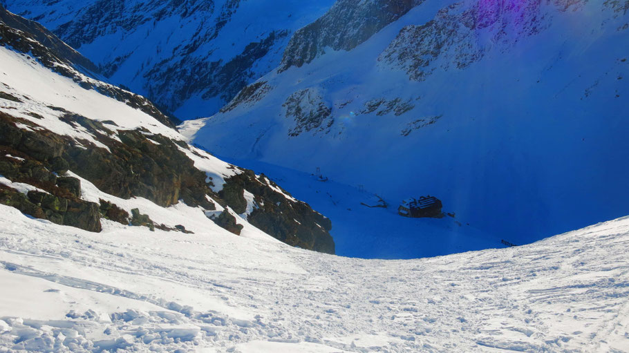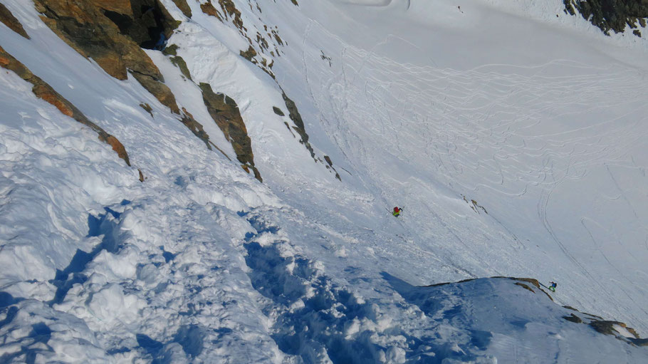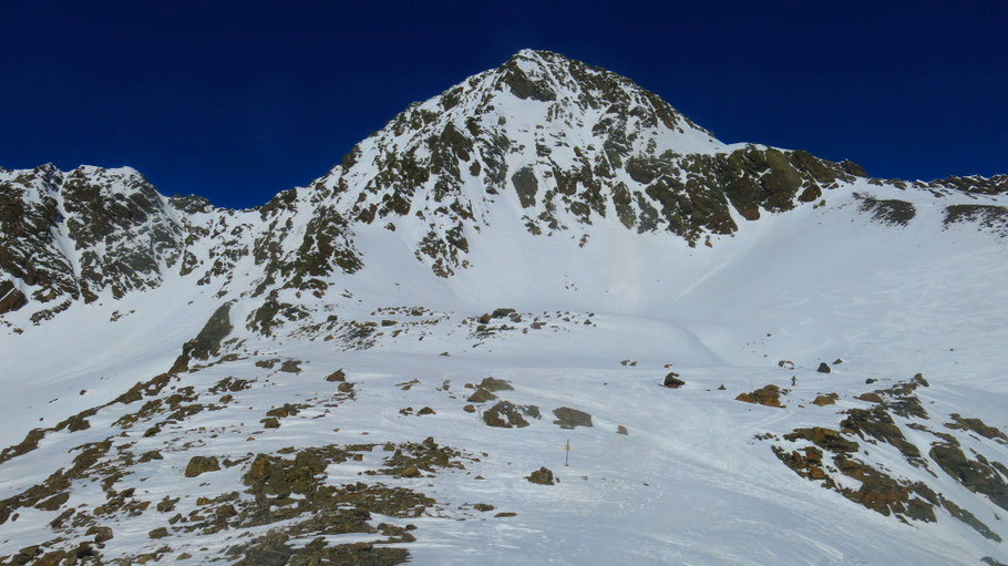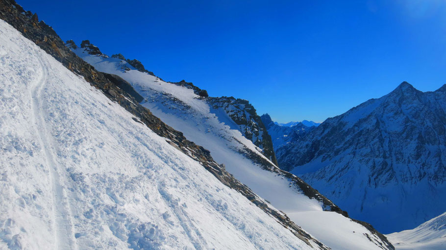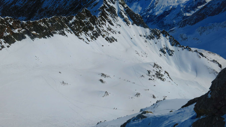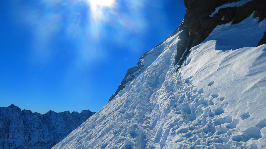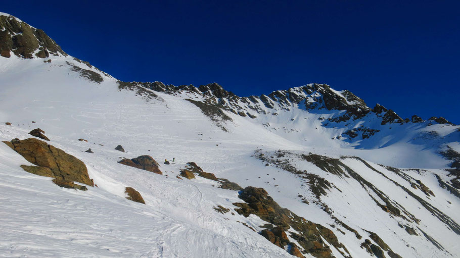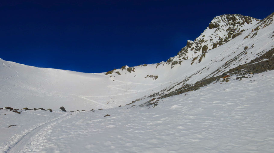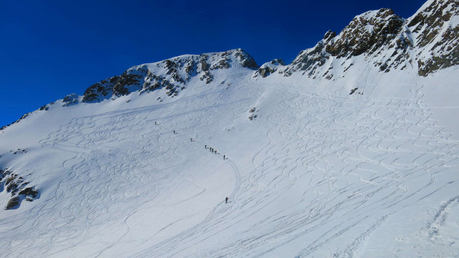 Skidepot an der Scharte. Die letzte Rinne hinauf zum Gipfel ist steil, heute aber beste Verhältnisse mit guter Stapfspur.