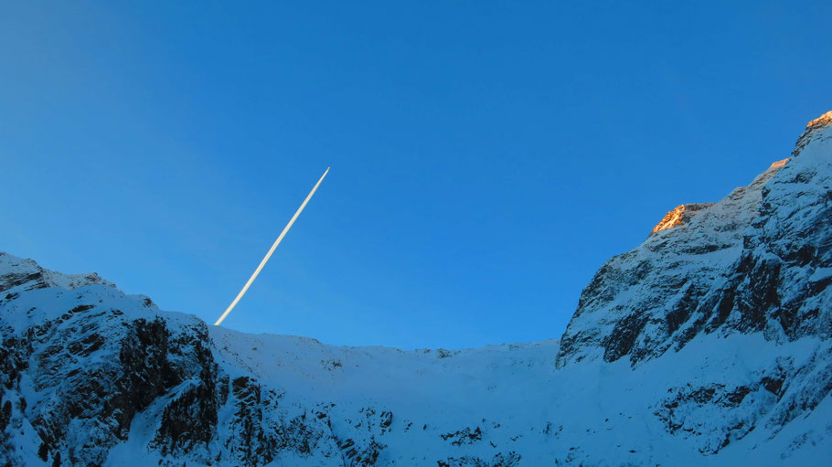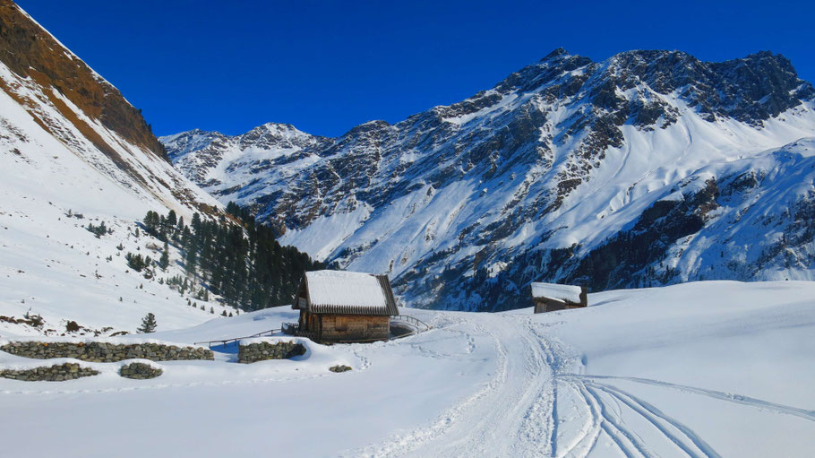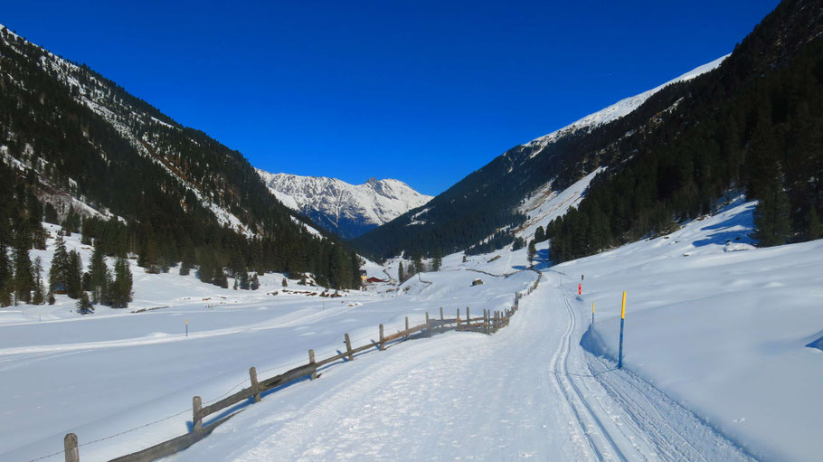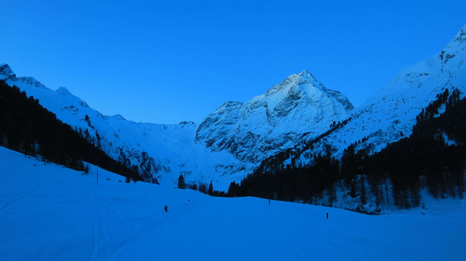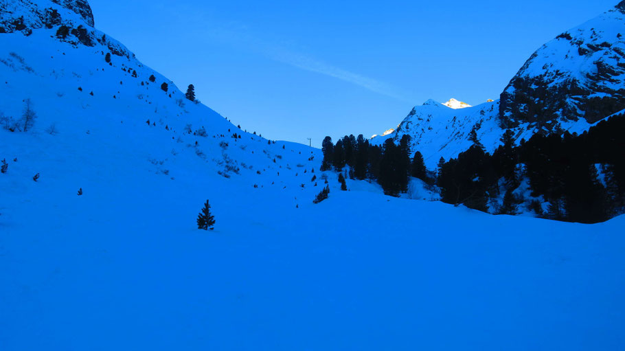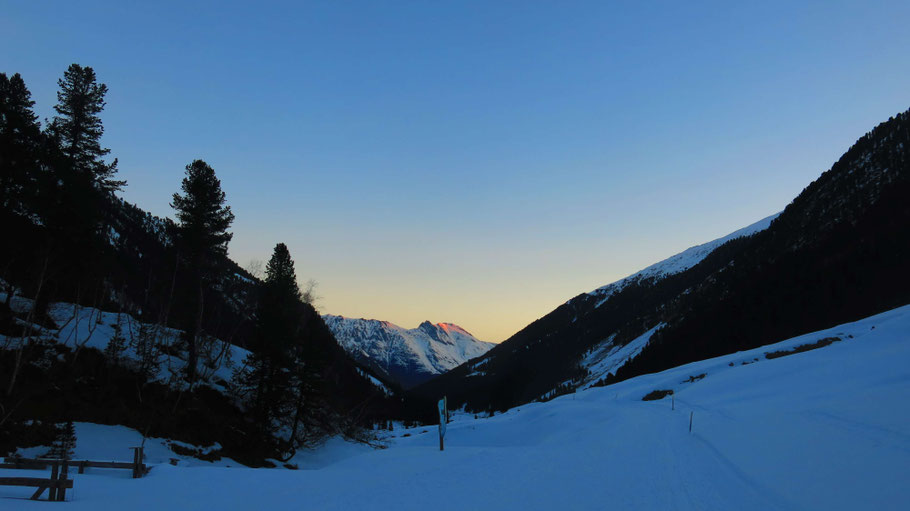 Die ersten paar hundert Meter im Langlaufstil in den hinteren Talschluß. Draussen im Sellraintal Sonnenaufgang über Roßkogel und Weißstein.