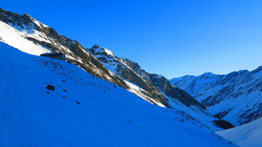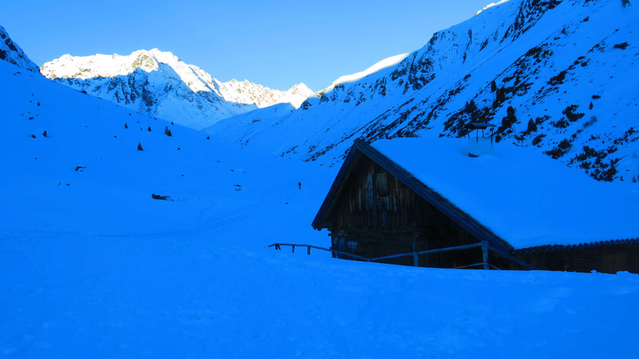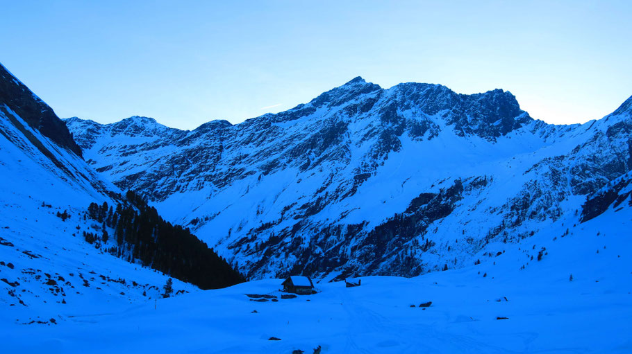 Frühmorgens im kalten Längental. Rückblick auf Längentalalm und Villerspitzen.