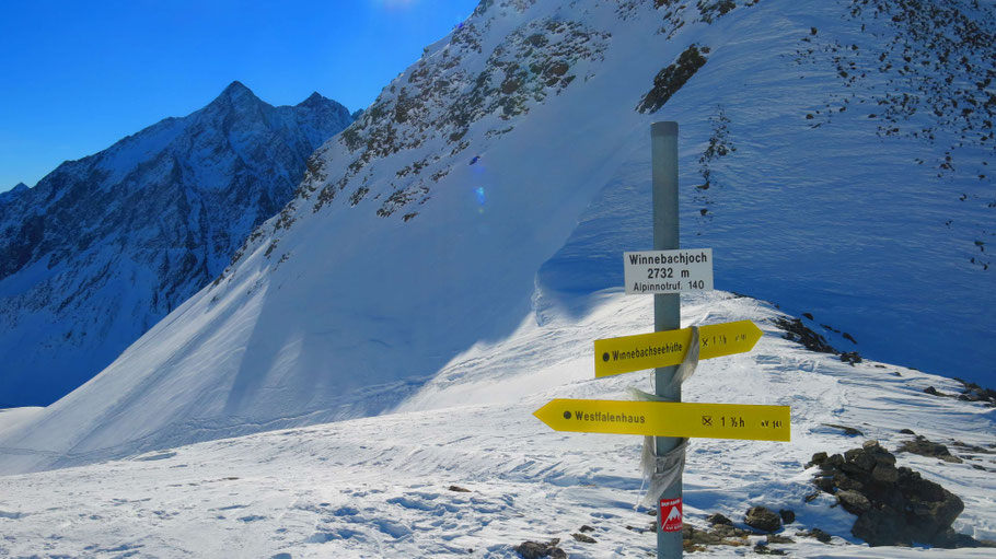 Schwierigkeitsgrad: Zustieg über weite Strecken leicht, der erste Waldgürtel vor der Längentalalm ist manchmal vereist. Kurzer steiler Aufschwung zum Winnebachjoch. Die letzten 150 Höhenmeter auf den Gipfel sind schwierig (S) und erfordern Spitzkehren bis zum Skidepot sowie in der letzten Rinne je nach Verhältnissen auch Steigeisen/Pickel.