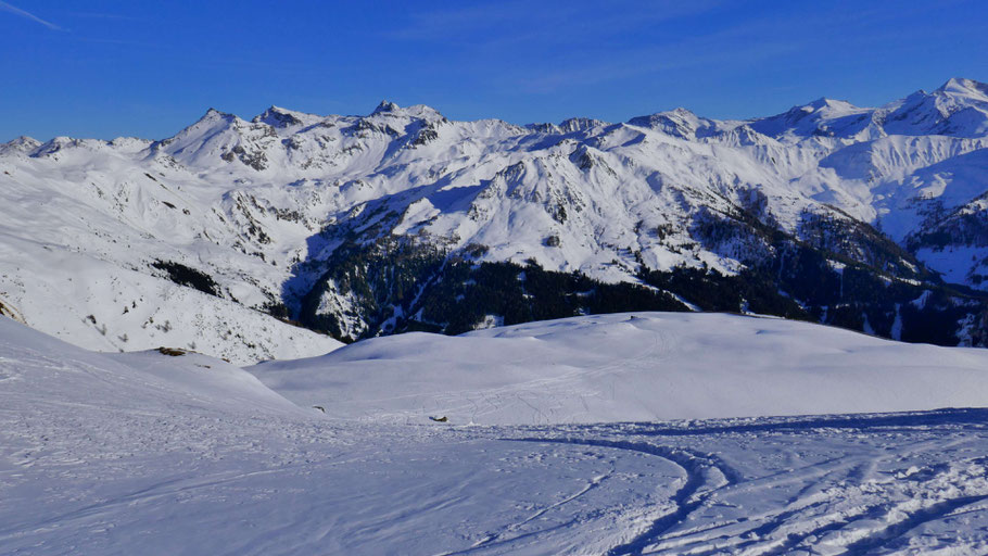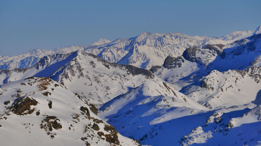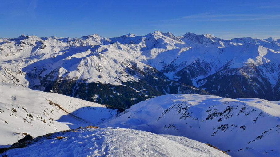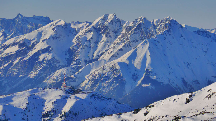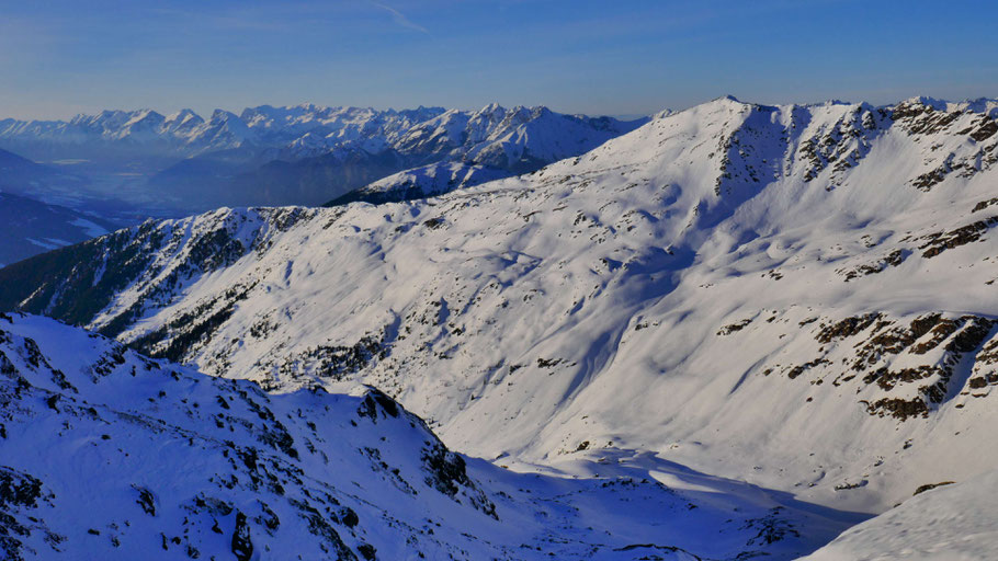 Im Osten die Graue Wand (2.596m) in der Wattener Lizum, ganz hinten die Wildkarspitze (3.073m) schon im Salzburger Land.