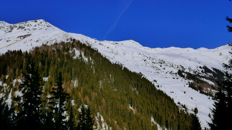 Zuerst führt der Weg etwas steiler hinauf durch den Wald. Gegenüber die Südseite der Naviser Sonnenspitze, die von der anderen Seite aus dem Voldertal ein echter Hatscher ist.