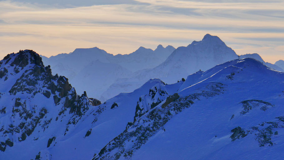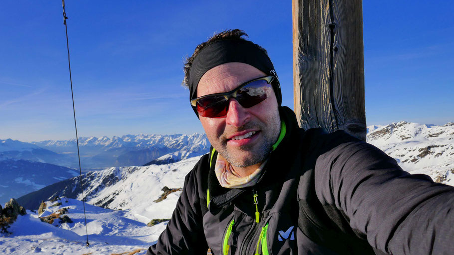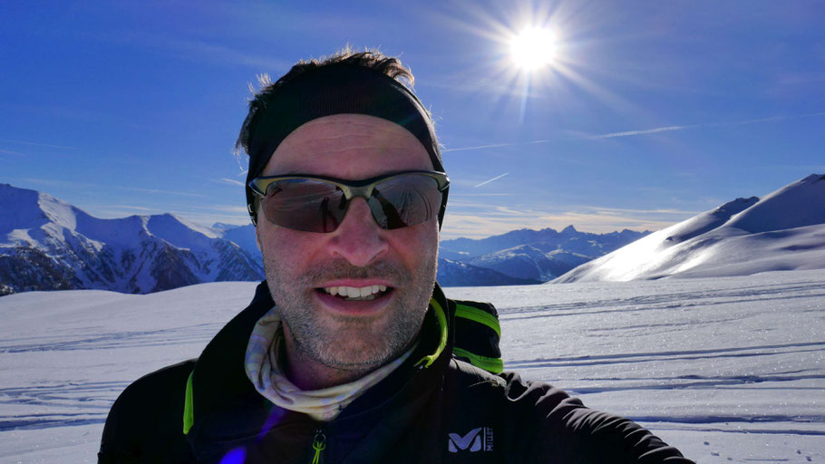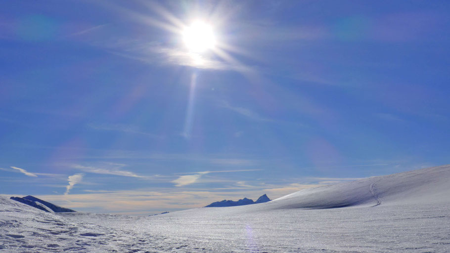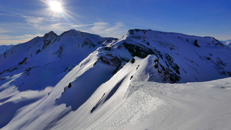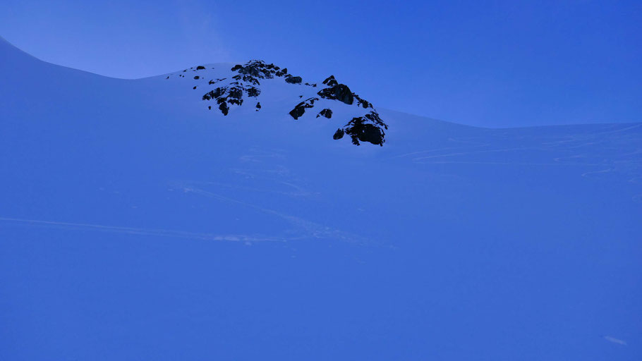Ein bisschen noch den Grat weiter. Aufgrund der starken Sonneneinstrahlung und der schlechten Schneequalität bin ich die letzten 20 Höhenmeter nicht mit den Ski hinauf, sondern...