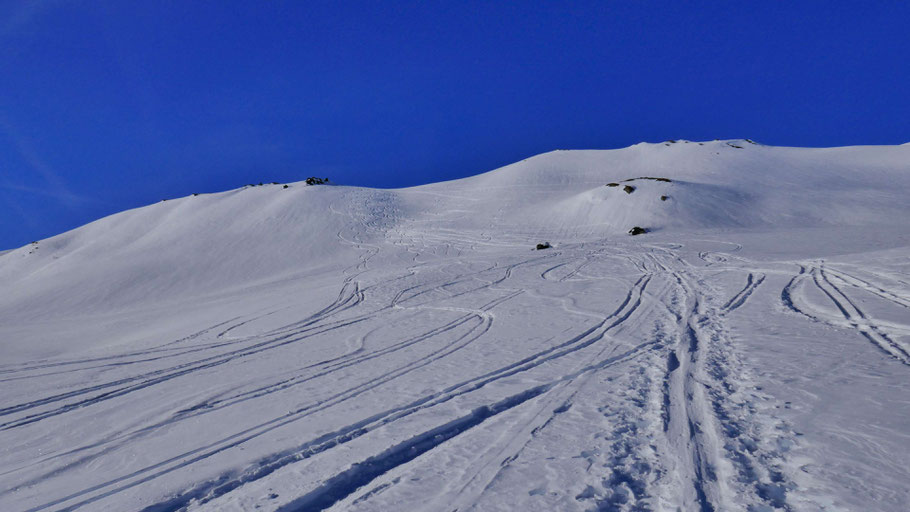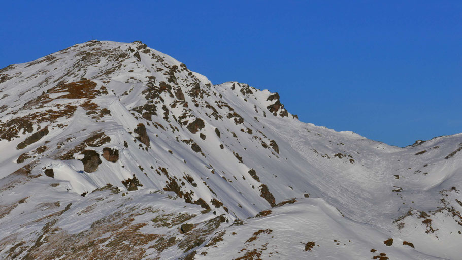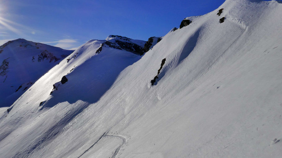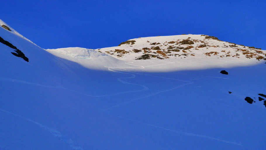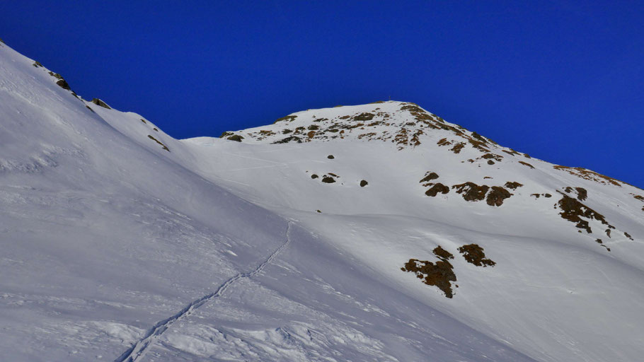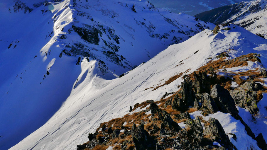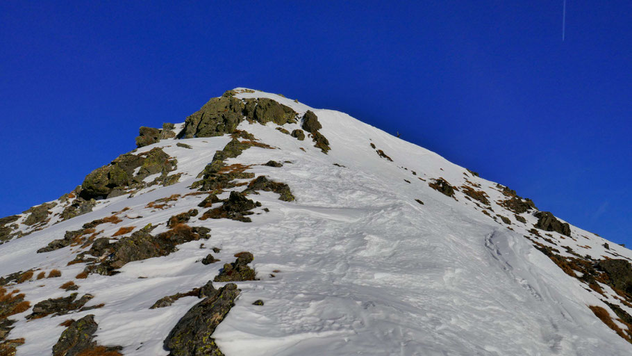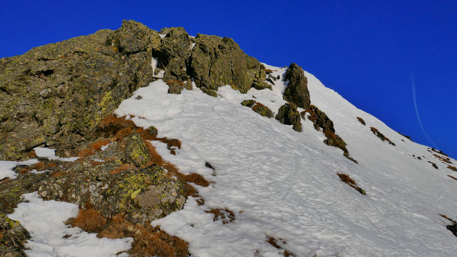 Ein Ausrutscher ist zu vermeiden. Man könnte den Gratanstieg auch nördlich im tiefen Schnee umgehen.