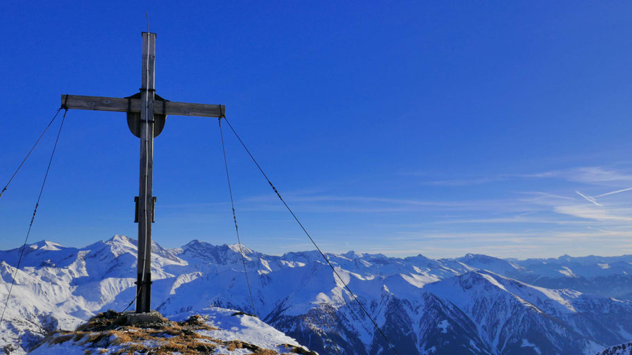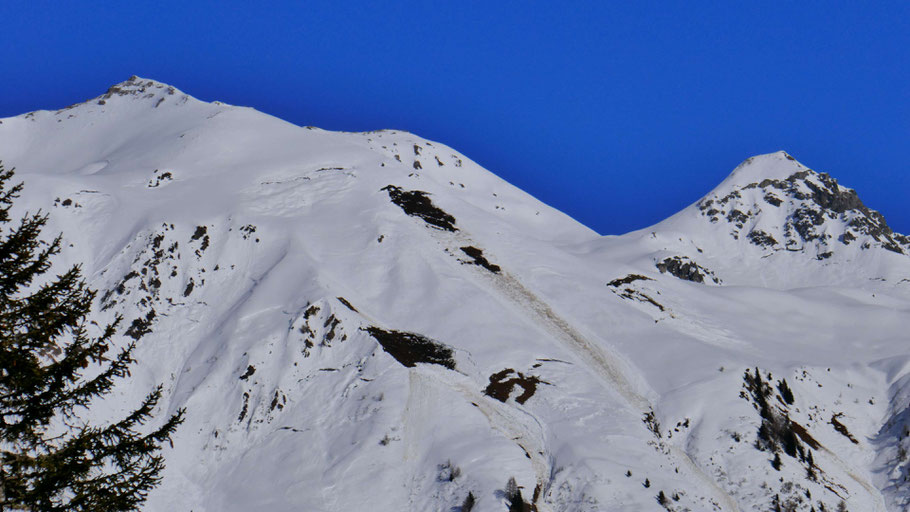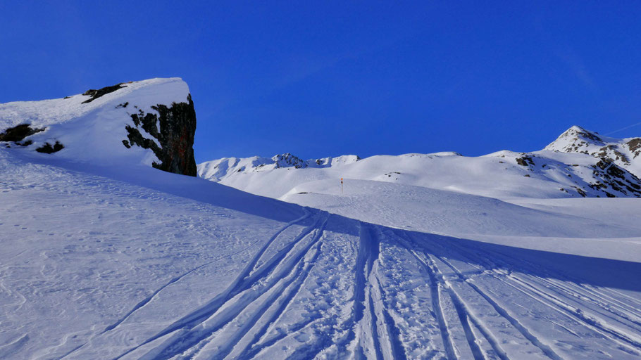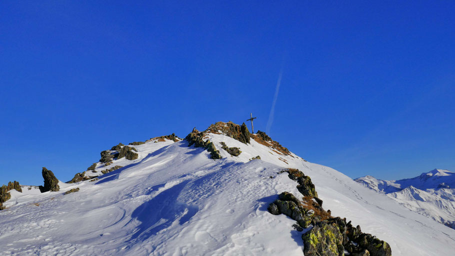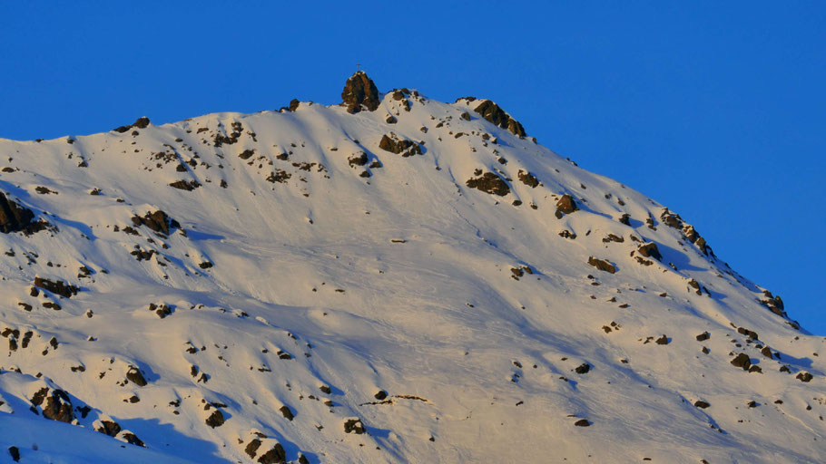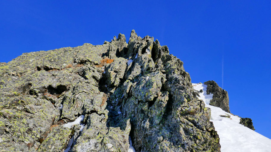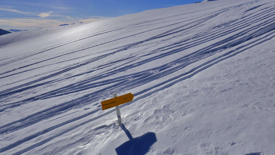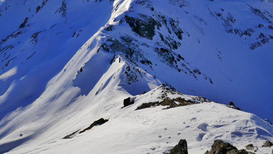 Ein Ausrutscher ist zu vermeiden. Man könnte den Gratanstieg auch nördlich im tiefen Schnee umgehen.