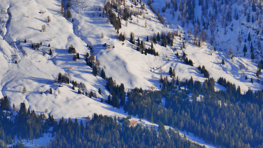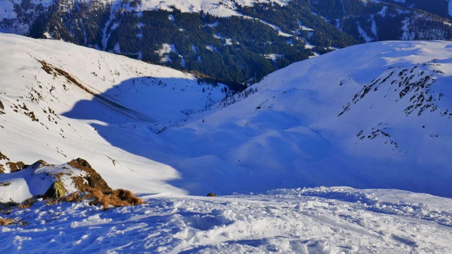 Meine Abfahrtsroute über die Grünbergalm schon im Schatten. Der Bruchharsch wartet.