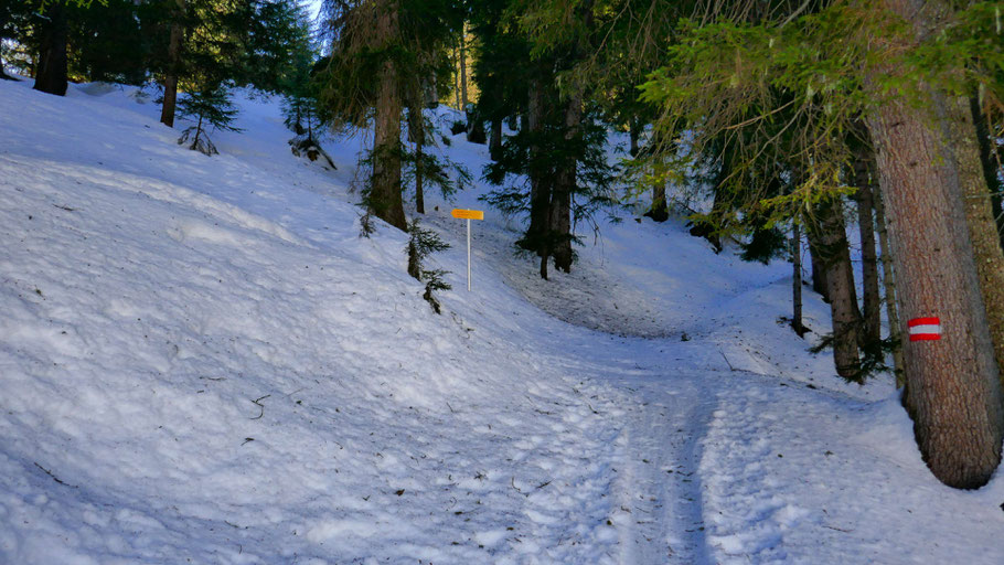 Nicht zu verfehlen die Abzweigung auf die Skitourenroute hinauf zur Seapnalm.